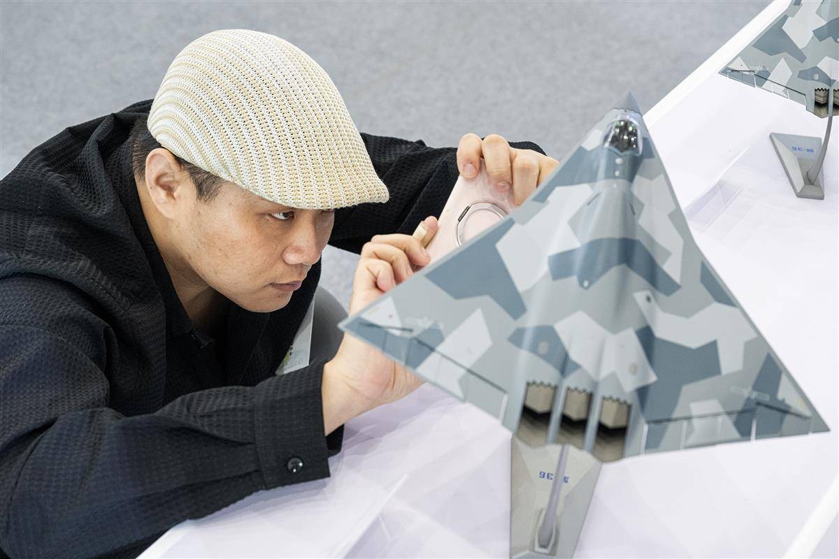 9月29日,一名军迷在6代机模型前拍照。(湖北日报全媒记者 任勇 摄)
