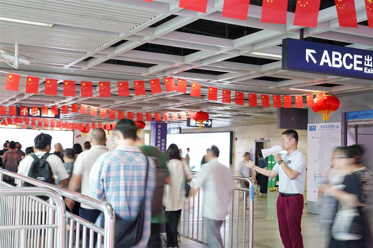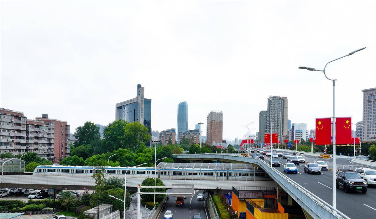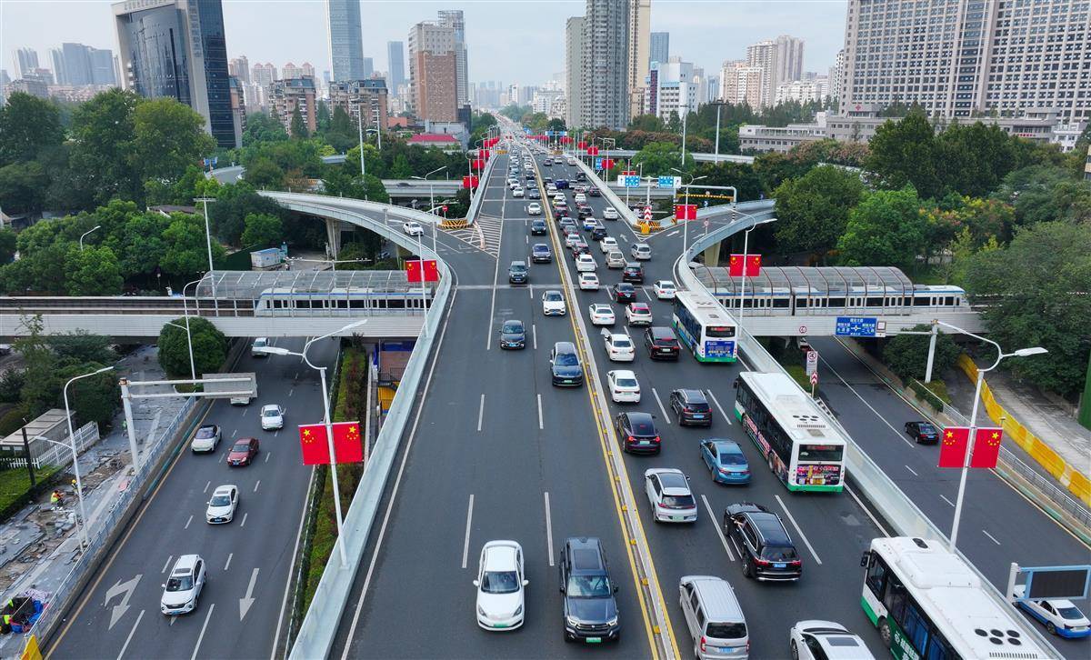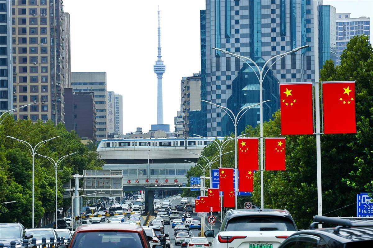 临近国庆,武汉市区主干马路挂起了国旗,乘坐地铁高架线路时,沿线一抹抹鲜艳的中国红让众多游客流连忘返。