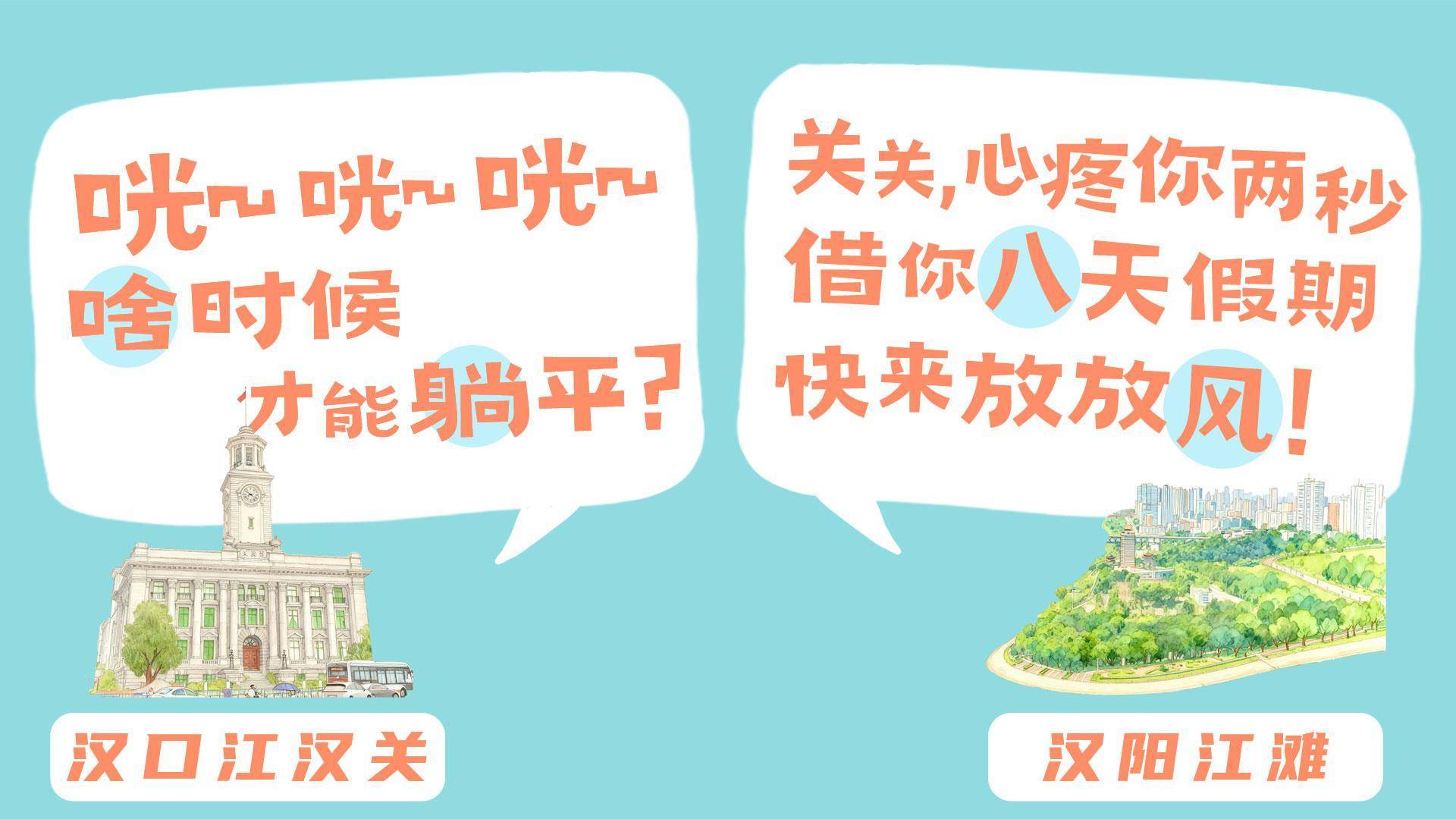 汉口江汉关的钟声还在回荡“啥时候才能躺平”,汉阳江滩已发出邀请:“关关,心疼你两秒钟,借你八天假期快来放放风”,像极了老友间的贴心调侃。