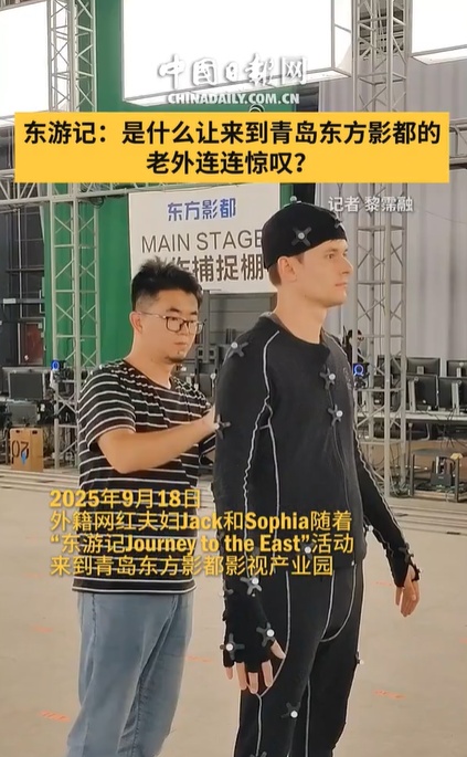 近日,跟随着“东游记Journey to the East”活动,外籍网红夫妇Jack和Sophia来到了位于青岛西海岸新区的东方影都影视产业园5号棚,精度达亚毫米级别的动作捕捉技术和实时渲染让他们看着屏幕中和自己同步的动画形象连连感叹:Amazing!(黎霈融)