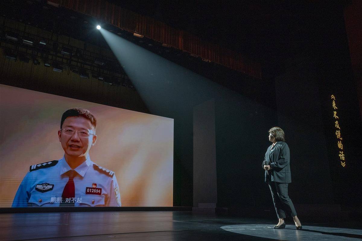 报告会现场,万松的妻子张熙与AI技术还原的丈夫隔空相望。