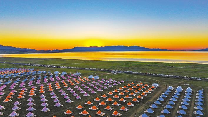 7月9日晨,露营的游客在赛里木湖观看日出。湖北支持赛里木湖升级为国家5A级旅游景区,通过组织包机等方式开展“百万湖北人游博州”活动,每年带动近30万湖北游客入疆旅游。