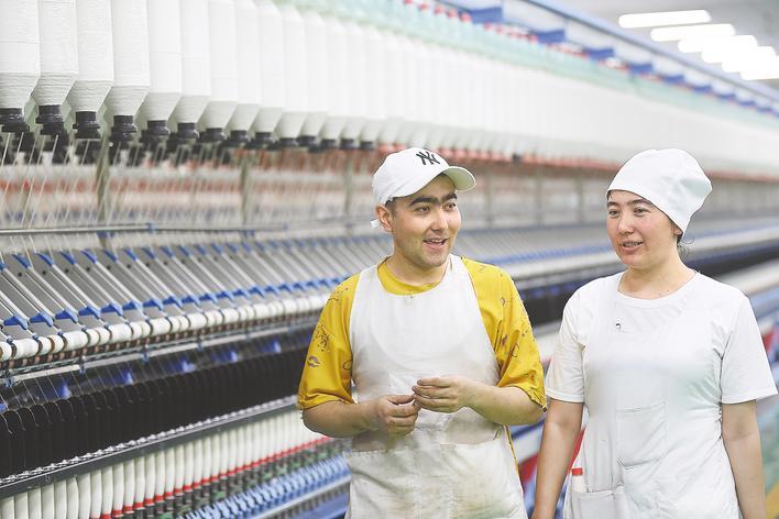 9月23日,在新疆金鑫昱纺织有限公司工作3年的古丽艾山·买买提明(右)和弟弟在工间休息。目前,湖北有序转移新疆就业人员1.5万余人,数量居全国第一;湖北援疆企业吸纳新疆就业人员5万多人,少数民族群众占比七成以上,拓宽了就业援疆新局面。