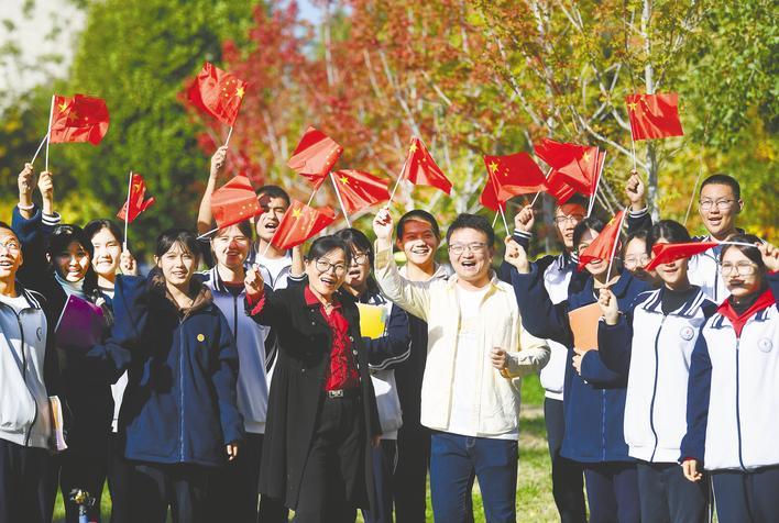 9月26日,华中师大一附中博乐分校内,援疆教师王琴、陈建树母子与学生举旗同庆。近年来,湖北援疆全力助推高质量教育体系建设,华中师大一附中博乐分校、黄冈中学五师分校高考成绩斐然。湖北100多所名校与博州学校结对,让“读书找湖北老师”家喻户晓。