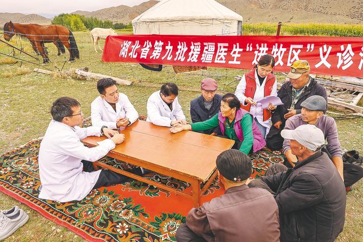 2023年9月15日,第九批援疆医生在博州牧区巡回义诊。湖北医疗援疆在全疆率先探索推进“援疆医生联盟”,让“看病找湖北医生”深入人心。