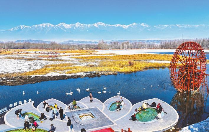 3月19日,温泉湿地水上温泉公园雪莲花泡池,当地居民和游客围坐在一起泡脚。作为湖北援疆惠民工程,该项目总投资1500万元,3大体验区34个温泉泡池能同时容纳500人免费泡脚。