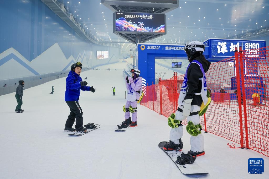 9月29日,在深圳·前海冰雪世界,教练(左)指导学员学习单板。