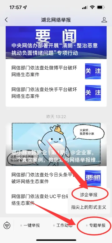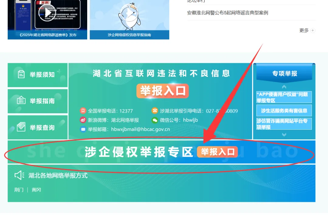 3.“湖北网络举报”微信号(ID:hbwljb)菜单栏-专题举报-涉企举报;