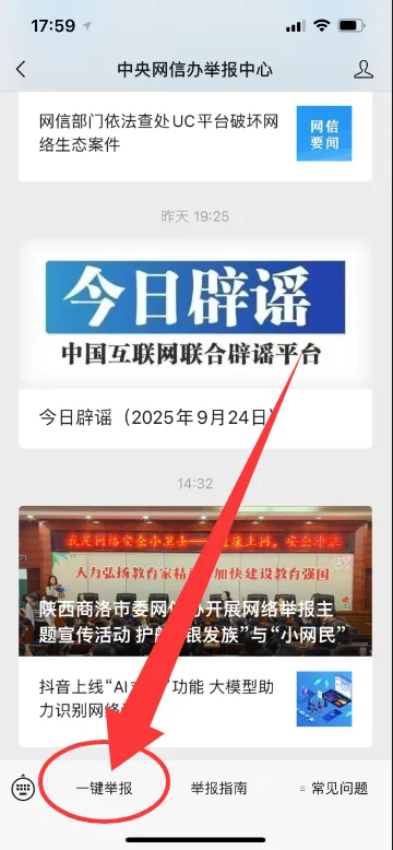 3.关注“中央网信办举报中心”微信号,进入菜单栏-一键举报;