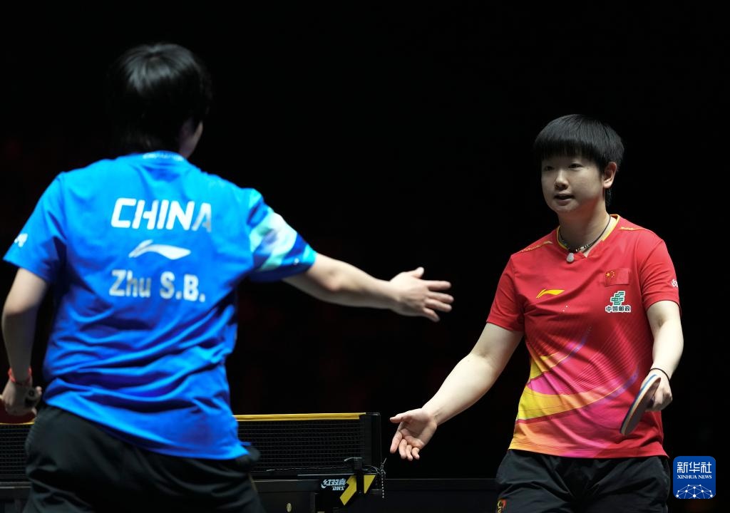 9月30日,孙颖莎(右)在比赛后和队友朱思冰致意。