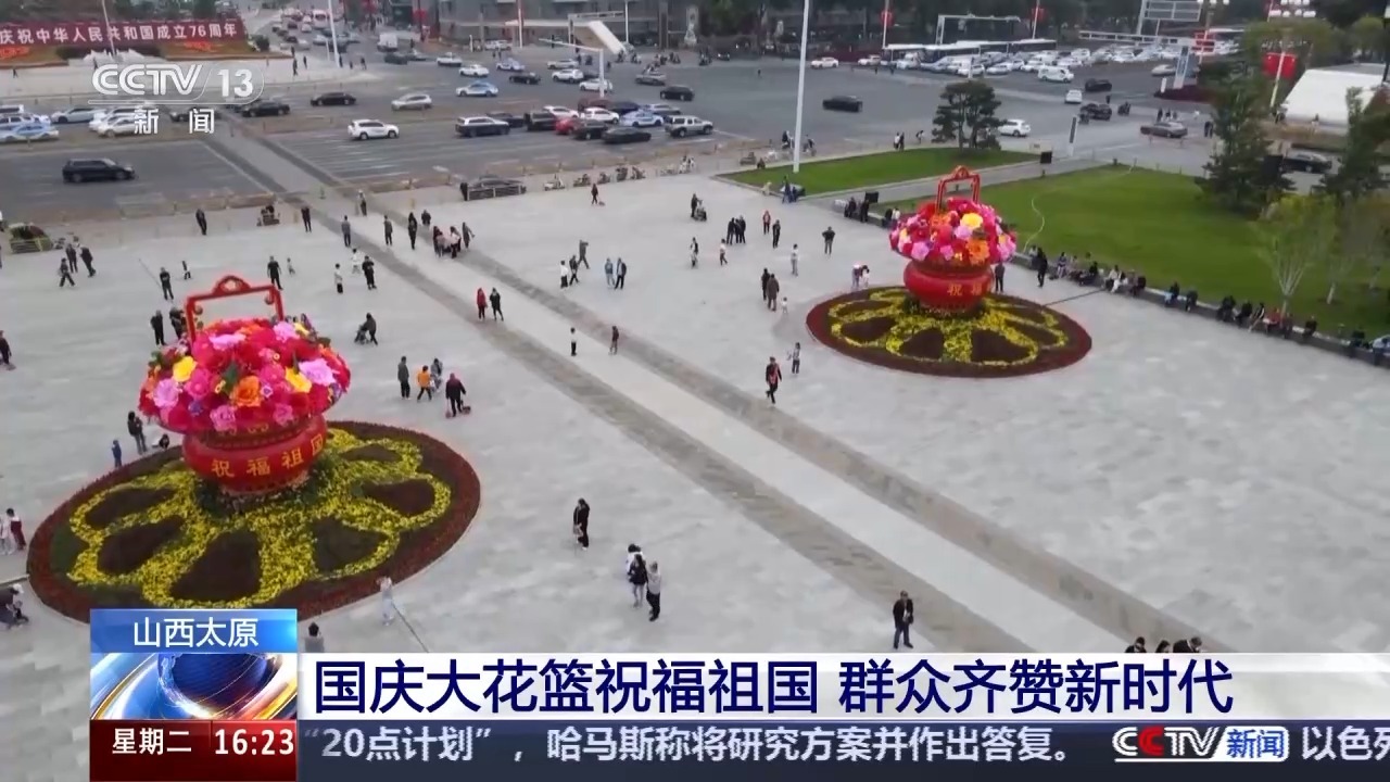在山西省太原市,两个写有“祝福祖国 欢度国庆”的巨型花篮在市中心的五一广场亮相,花篮造型独特、色彩缤纷,带来一派欣欣向荣的景象。喜庆的大花篮吸引众多市民游客前来打卡拍照。