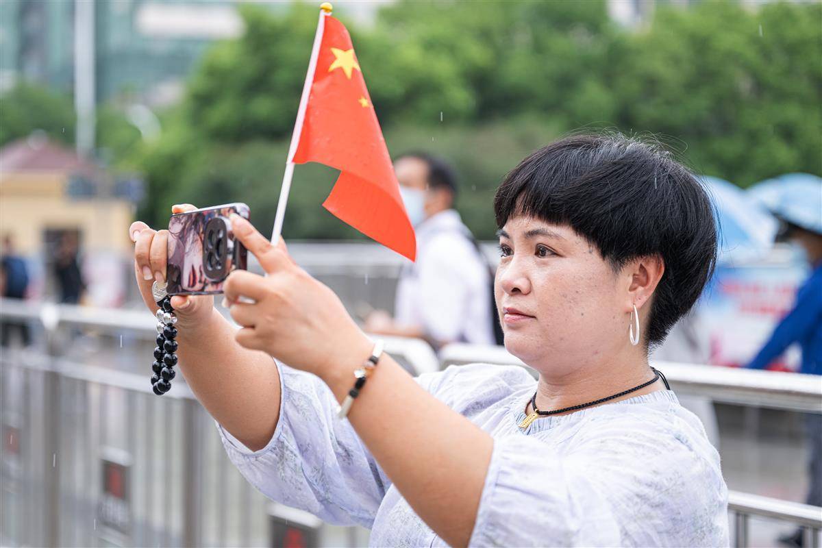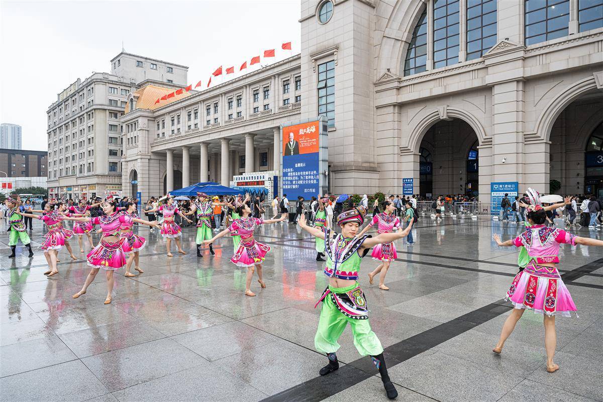 9月30日,在汉口火车站南广场,来自恩施州来凤县的20名土家族舞者快闪表演国家级非遗恩施摆手舞,伴着民族乐曲的节奏,舞者们演绎了“单摆”“双摆”“回旋摆”等经典动作,展现土家族文化的独特魅力,为国庆中秋假期出行的旅客营造了浓厚的节日氛围,现场不少匆匆赶路的旅客停下脚步拍照记录。