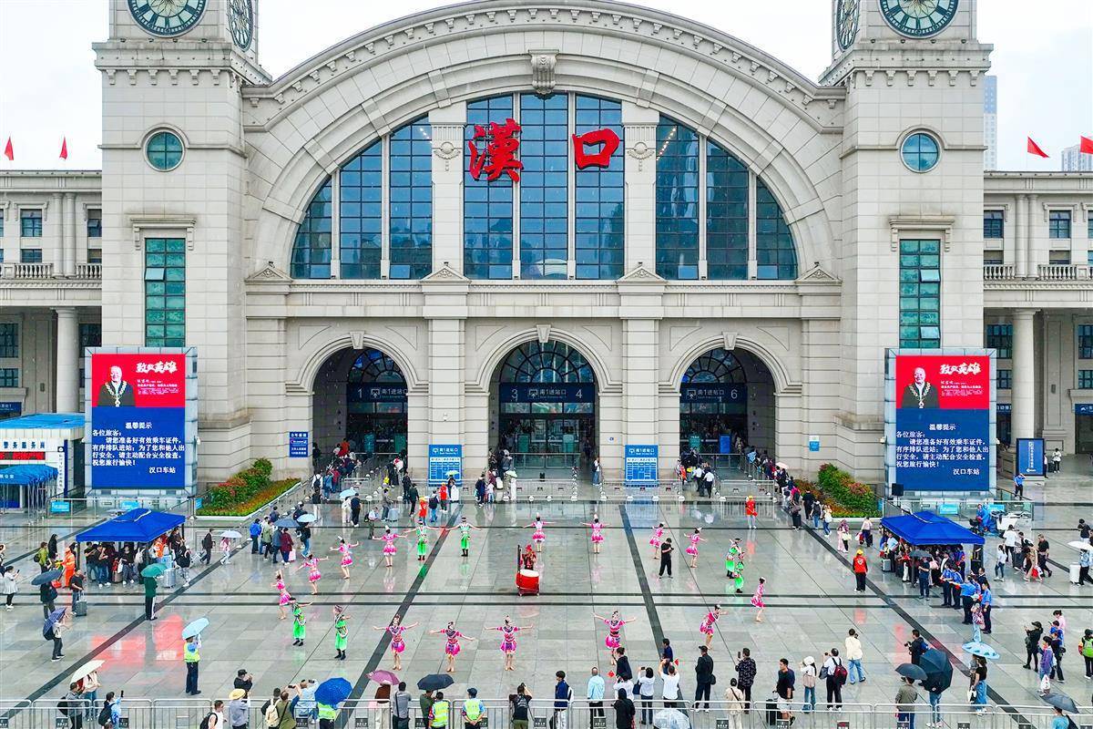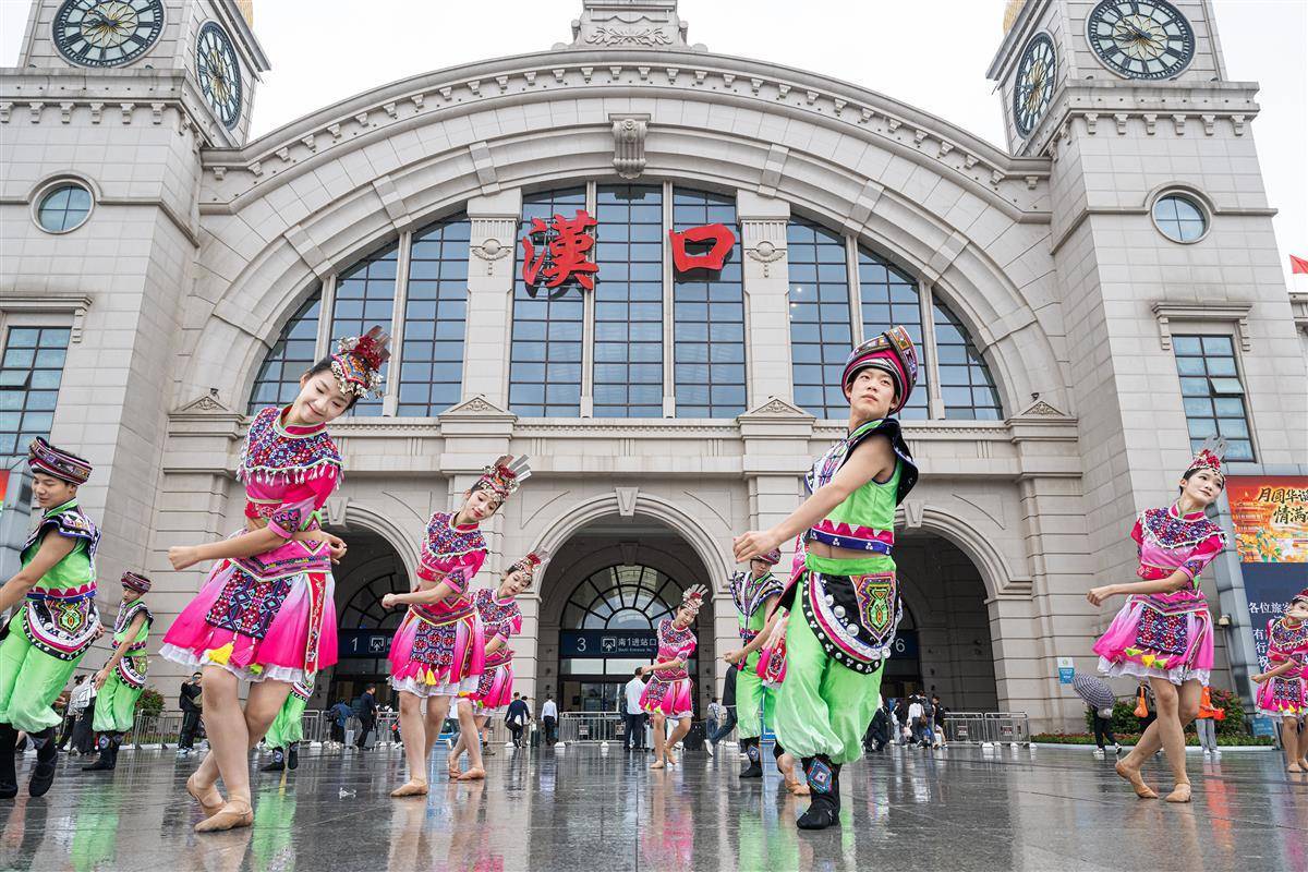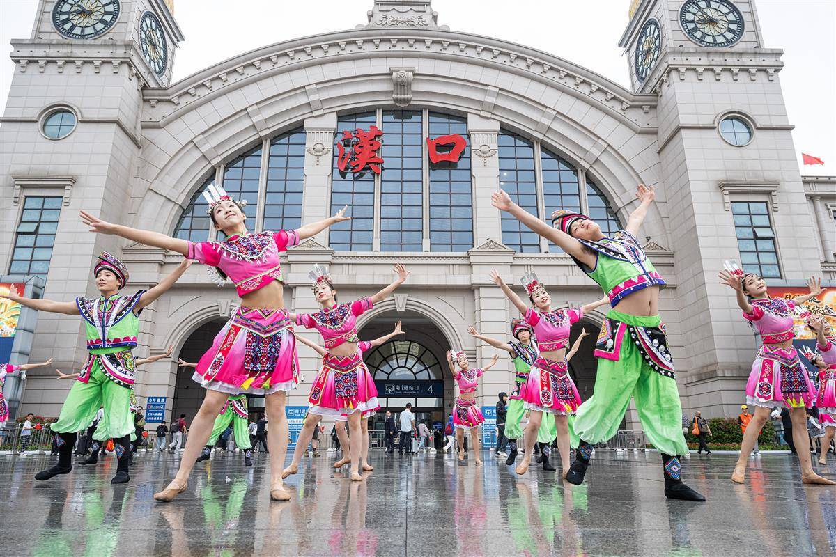 在汉口火车站南广场,来自恩施州来凤县的土家族舞者快闪表演国家级非遗恩施摆手舞。