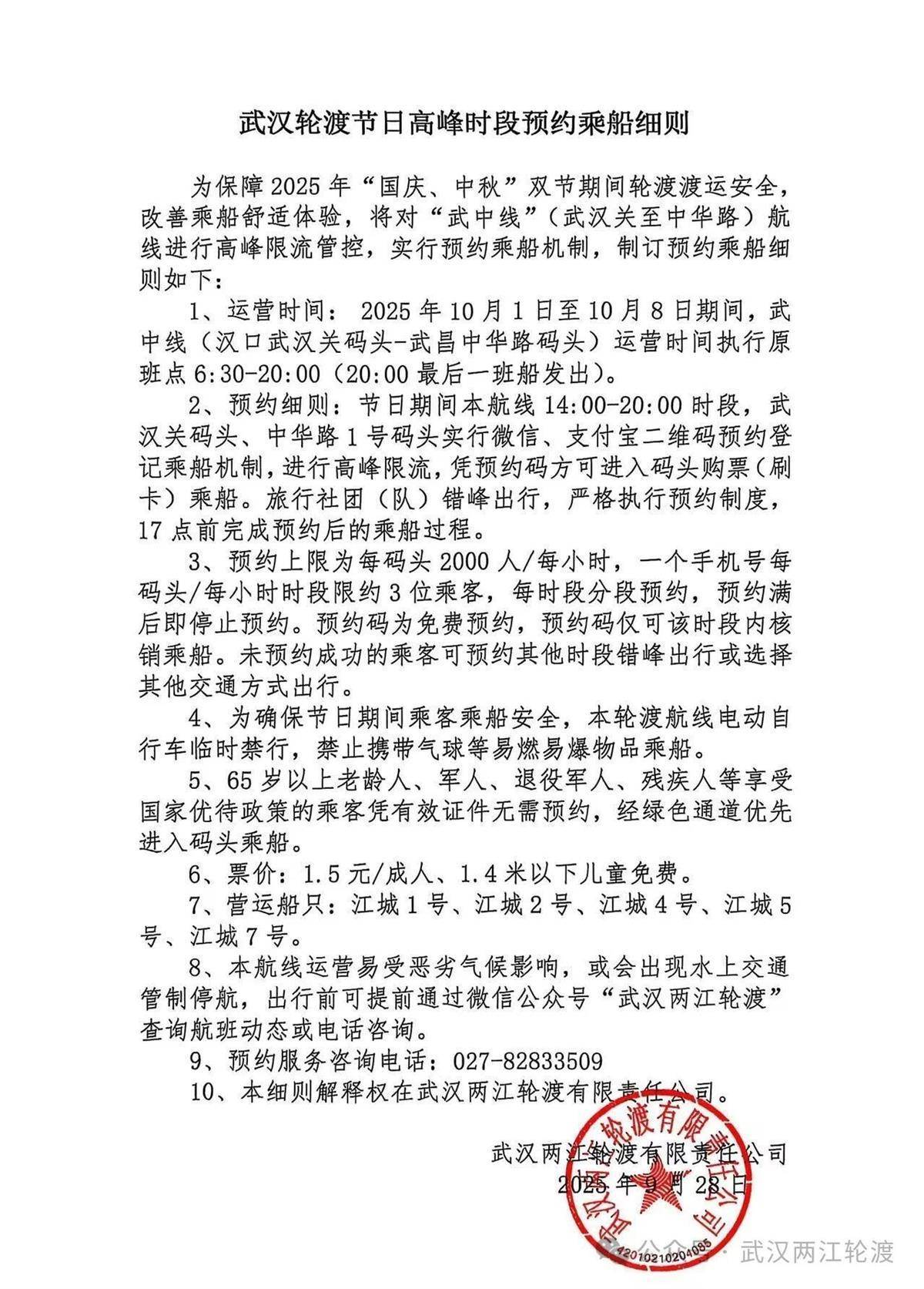 湖北日报讯(记者冯袁玥、通讯员邹密)9月30日,武汉两江轮渡发公告称,为保障今年“国庆中秋双节”期间轮渡渡运安全,改善乘船舒适体验,将对“武中线”(武汉关至中华路)普客渡航线进行高峰限流管控和实行预约乘船机制。通告如下: