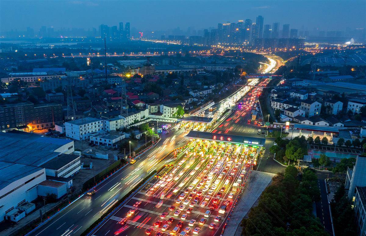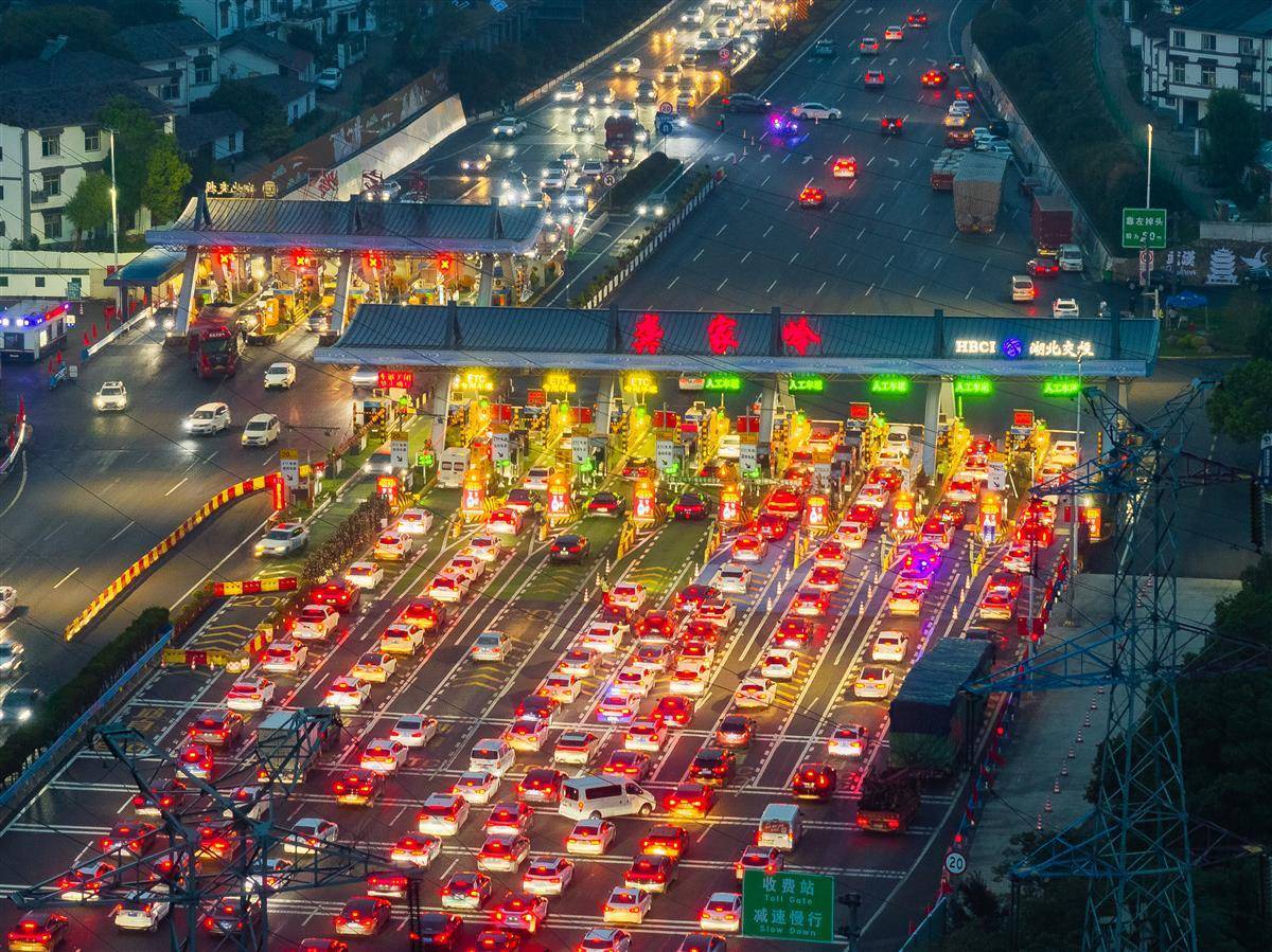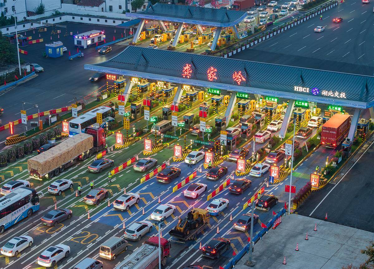 9月30日傍晚,武鄂高速公路武汉龚家岭收费站,出行和抵达的车流汇聚于此,从高空俯瞰宛如长龙。当天,中秋国庆长假正式开启,武汉市进出城通道、火车站周边、热门景区及大型活动场馆周边的道路交通压力显著增大。(湖北日报全媒记者 柯皓 摄)