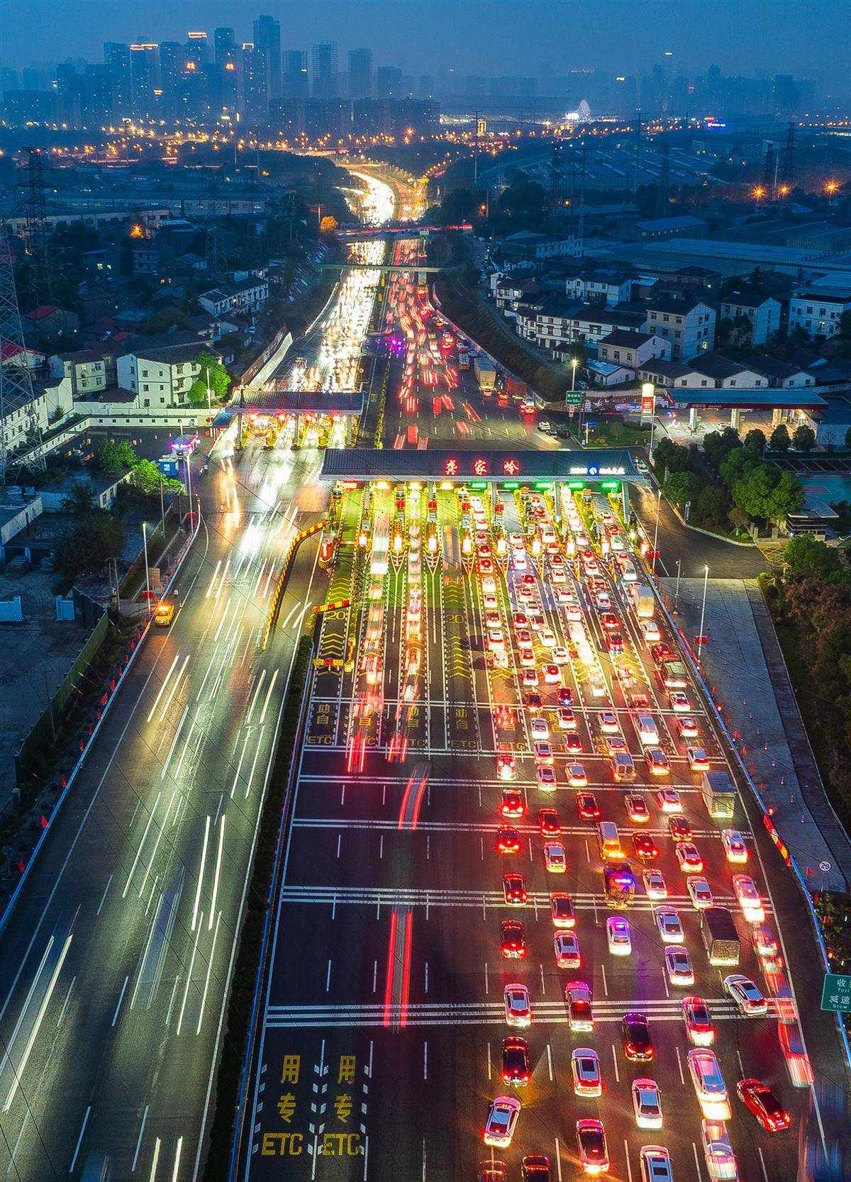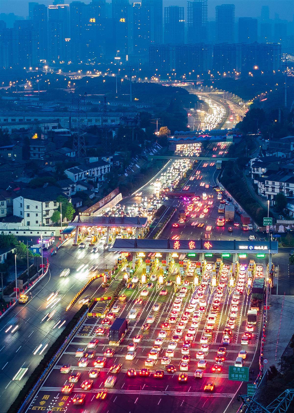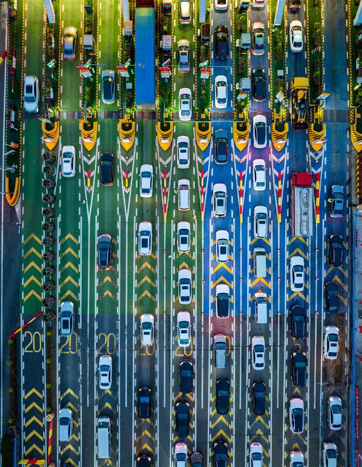 9月30日傍晚,武鄂高速公路武汉龚家岭收费站,出行和抵达的车流汇聚于此,从高空俯瞰宛如长龙。当天,中秋国庆长假正式开启,武汉市进出城通道、火车站周边、热门景区及大型活动场馆周边的道路交通压力显著增大。(湖北日报全媒记者 柯皓 摄)
