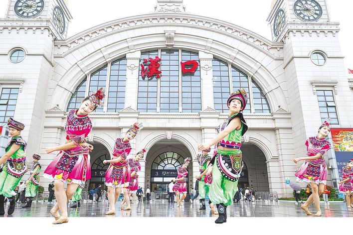 9月30日在汉口火车站,舞者跳起恩施摆手舞欢迎南来北往的旅客。 (湖北日报全媒记者 任勇 实习生 邓婷婷 摄)