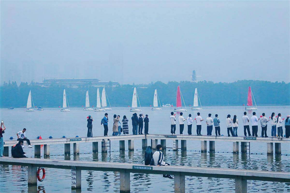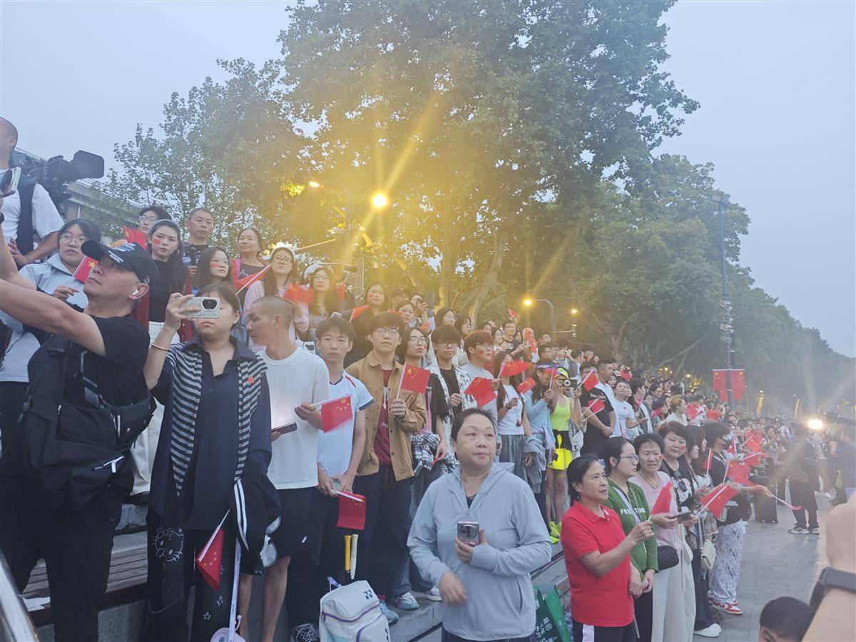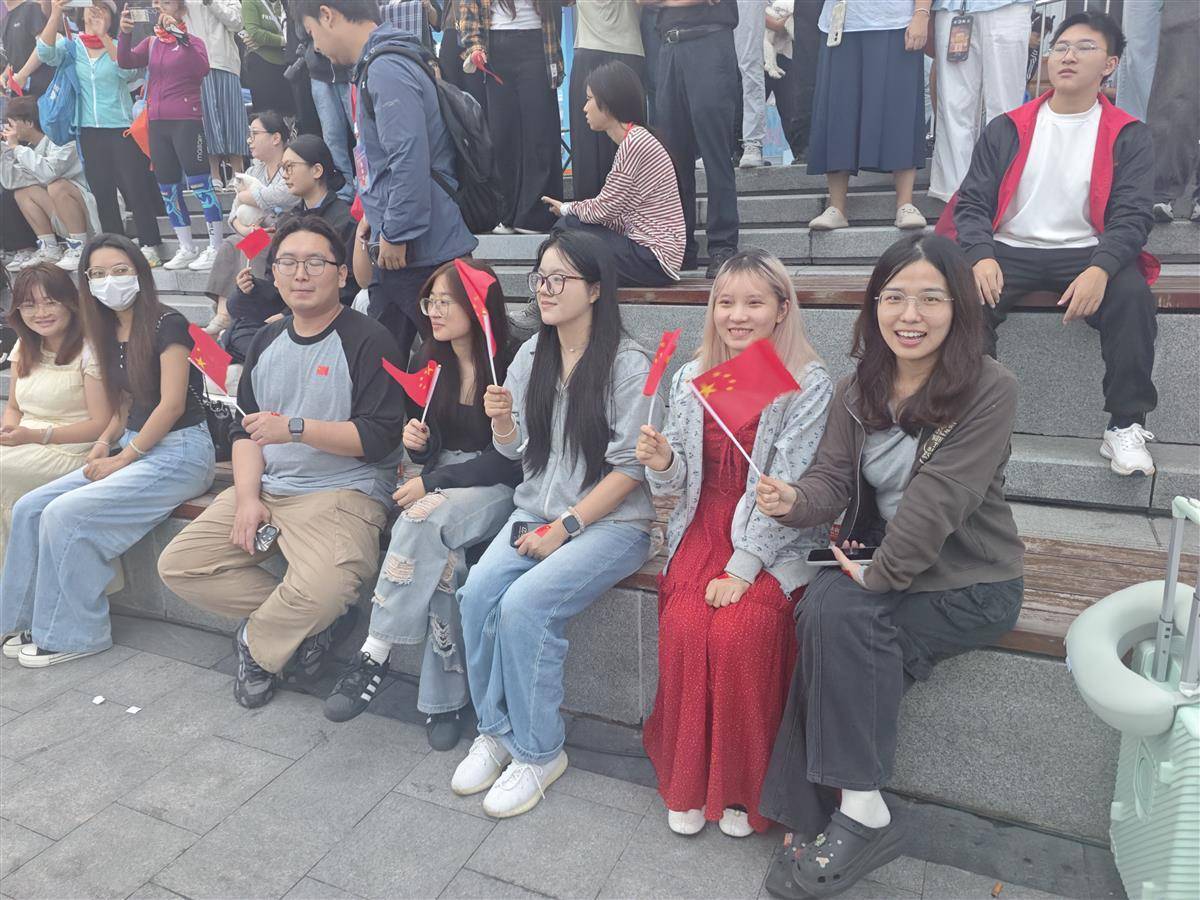 当天清晨,凌波门观景点早早聚集起千名游客,不少是连夜赶来的外地游客,行李箱在入口处摆放成一长排。“我们凌晨3点多到武汉,就直接打车过来了,没想到这里还有演唱活动,千帆竞发的场面非常壮观,结束后打算直接去东湖边的湖北省博物馆继续玩。”西安高校学生余同学说。广东游客梁楚玲则与祖国同天生日,浓厚的节日氛围让她不免哽咽:“今年我的农历生日正好在十一当天,和这么多人一起合唱国歌时,眼睛不免有些湿润,自豪之情油然而生,在武汉的第一天就收获了太多惊喜与感动,祝福祖国!”