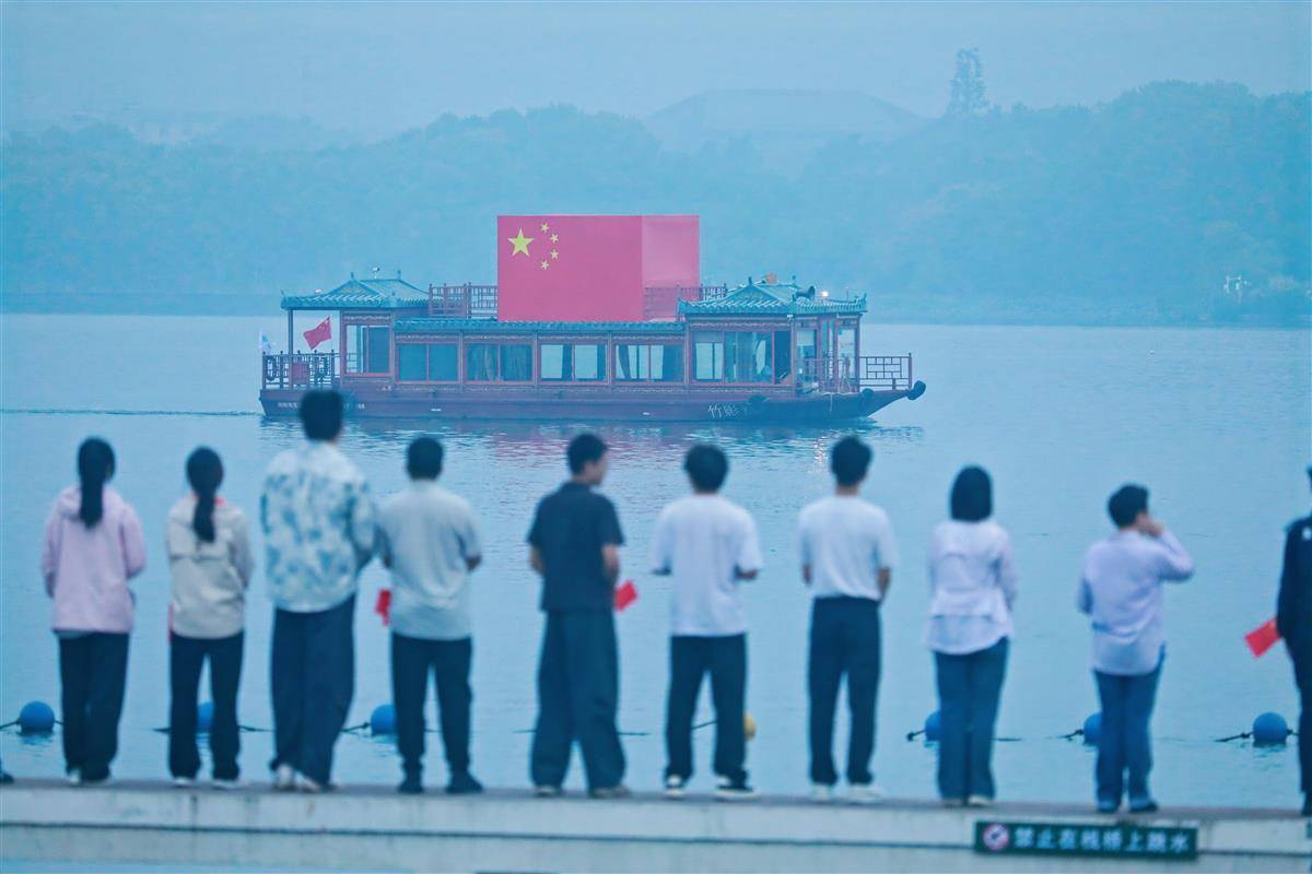 随着东方破晓,岸上游客、船艇水手共同高唱《歌唱祖国》《万疆》《红旗飘飘》等歌曲,游客手中的国旗挥舞,歌声与湖上船阵呼应,构成最热烈的国庆祝福。在水陆合唱的尾声,伴随现场游客齐声倒数的发令,5艘东湖画舫游船、10艘帆船、8艘智能无人船、8艘创意小游船组成的水上方阵载着巨幅国旗,迎着日出,追光出航。