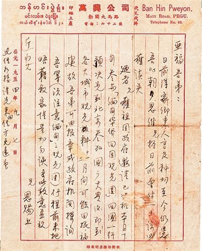 对于在“泉州汽车工场”工作的弟弟,李恩赐殷殷嘱托,希望弟弟积极工作,成为劳动模范。在缅甸,李恩赐开设万兴公司,从事贸易相关工作,坚持捐建多所华文学校,将对祖国的一腔热忱投入当地华社工作中。1950年,缅甸勃固华侨协会成立,李恩赐任首届理事长。同年6月8日,中缅建交。李恩赐与弟弟的通信,记录着新中国的发展变化,也饱含李恩赐与家人在海内外共同助力新中国建设的热望。