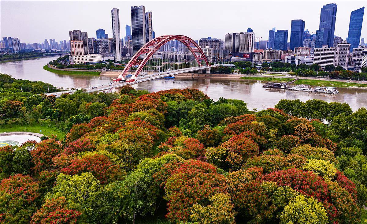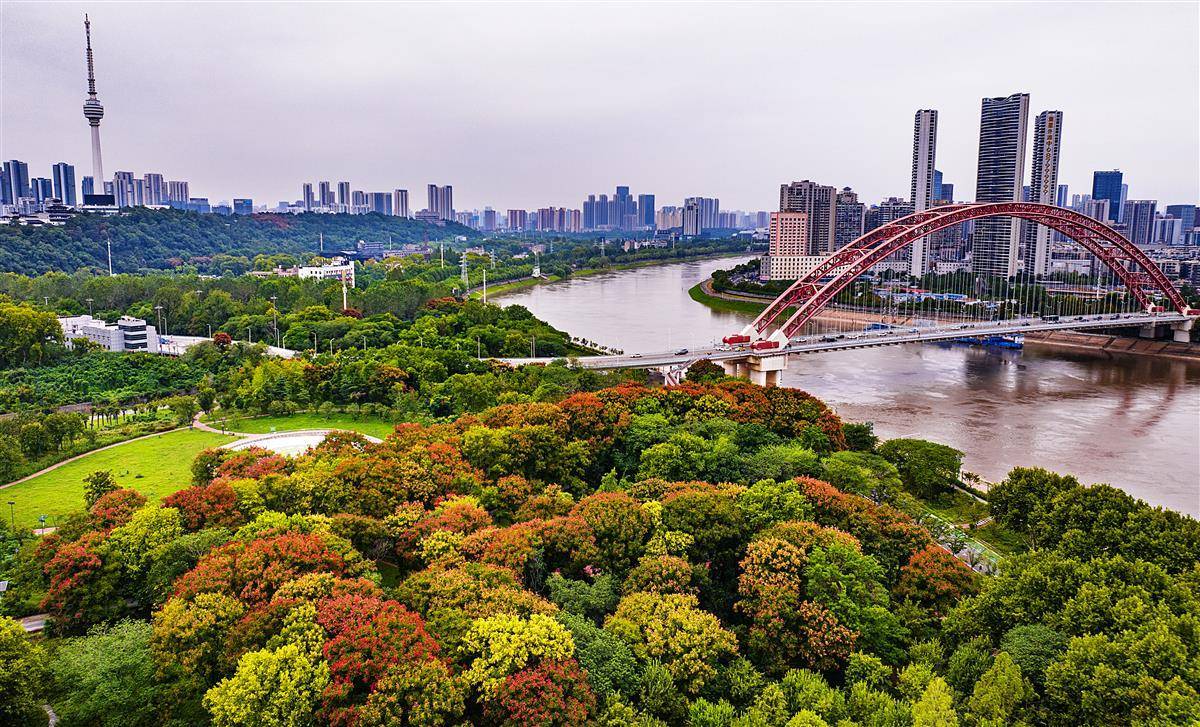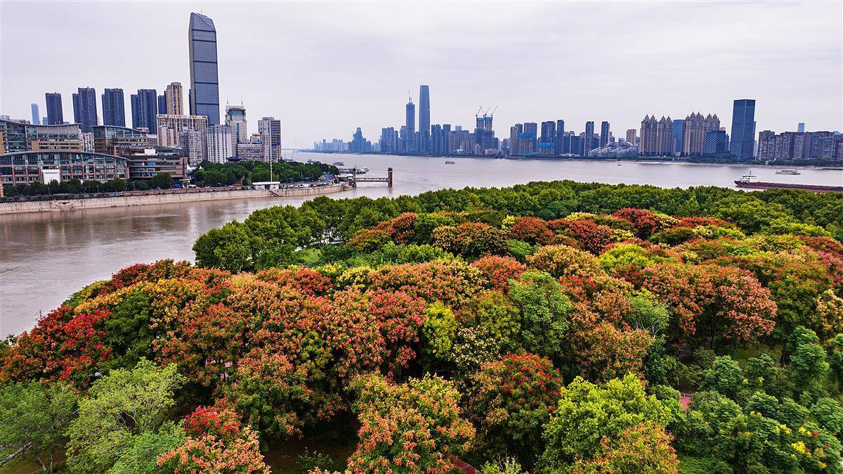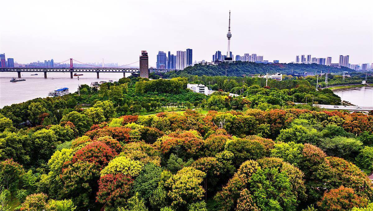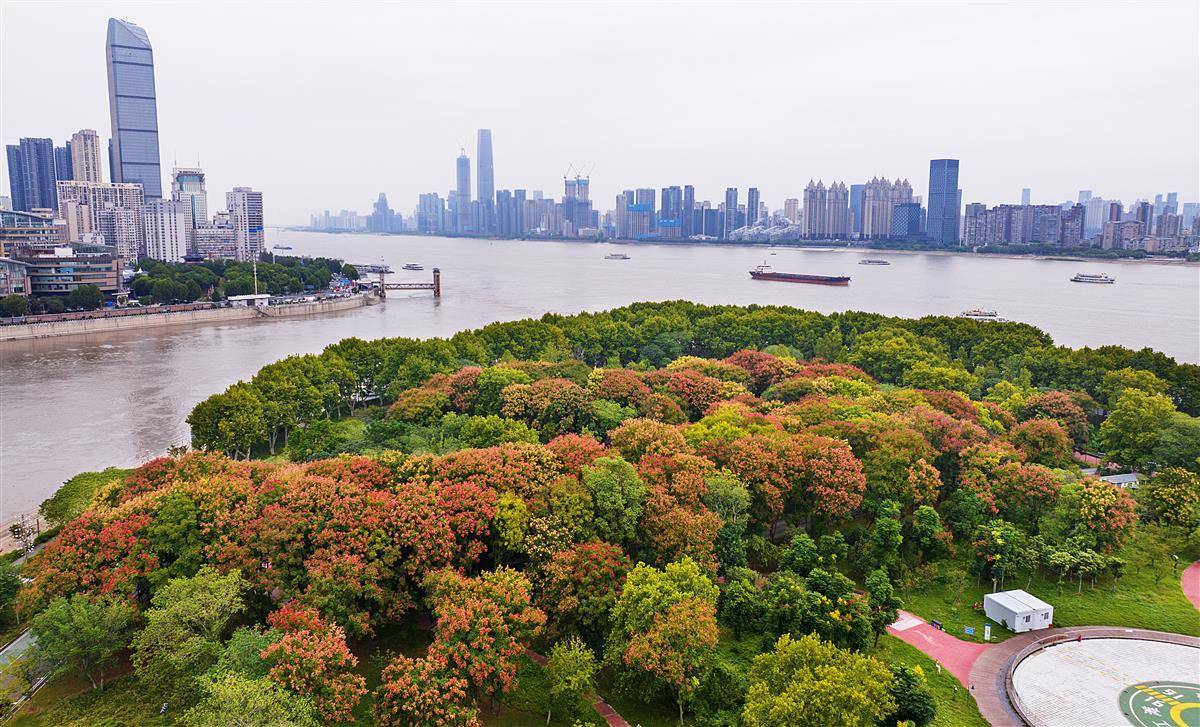 9月30日,鸟瞰武汉南岸嘴滨江公园,栾树的绿叶、黄花、红果,三种色彩交织在一起,仿佛打翻了秋天的调色盘。被称为武汉“城市之心”的南岸嘴,是长江和汉江交汇处形成的冲积地带。目前的“城市之心”因栾树的花果“由绿到彩”的渐变。金秋时节,遍布武汉的栾树便会上演一场色彩交织的秋日大剧。(湖北日报全媒记者 朱熙勇 摄)