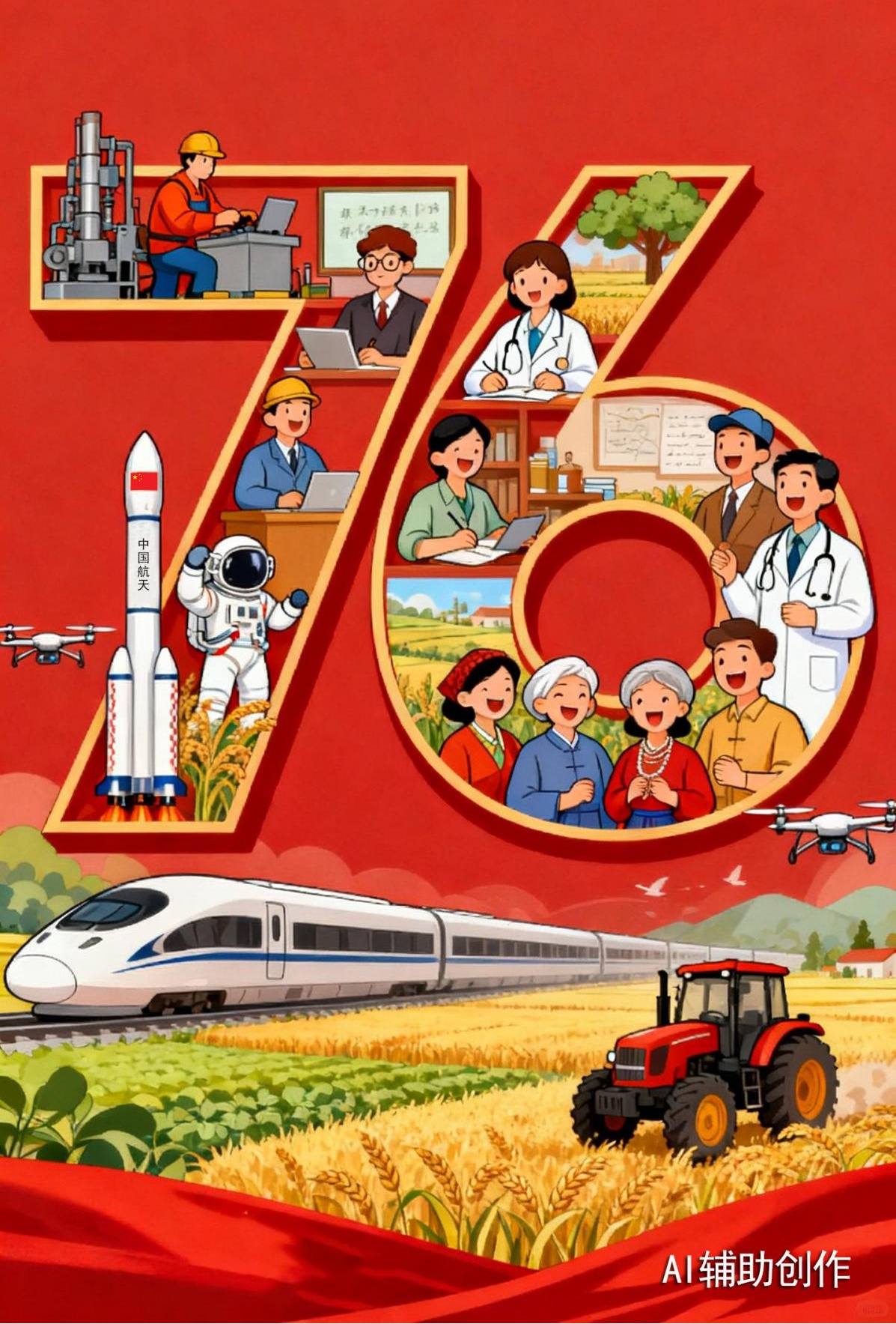 76载风雨兼程,76载砥砺奋进,中华民族迎来了从站起来、富起来到强起来的伟大飞跃。中国人民以“敢教日月换新天”的豪情壮志,自力更生、艰苦奋斗。从“两弹一星”的惊天伟业到“嫦娥探月”的飞天梦想,从“蛟龙号”深潜海底到“复兴号”驰骋神州,一项项发展成果,凝聚着无数人的汗水与心血,彰显着中国人民的智慧与力量。中国人民正以“逢山开路、遇水架桥”的闯劲,以“千锤百炼、迎难而上”的韧劲,在新时代的道路上不断书写新的辉煌。