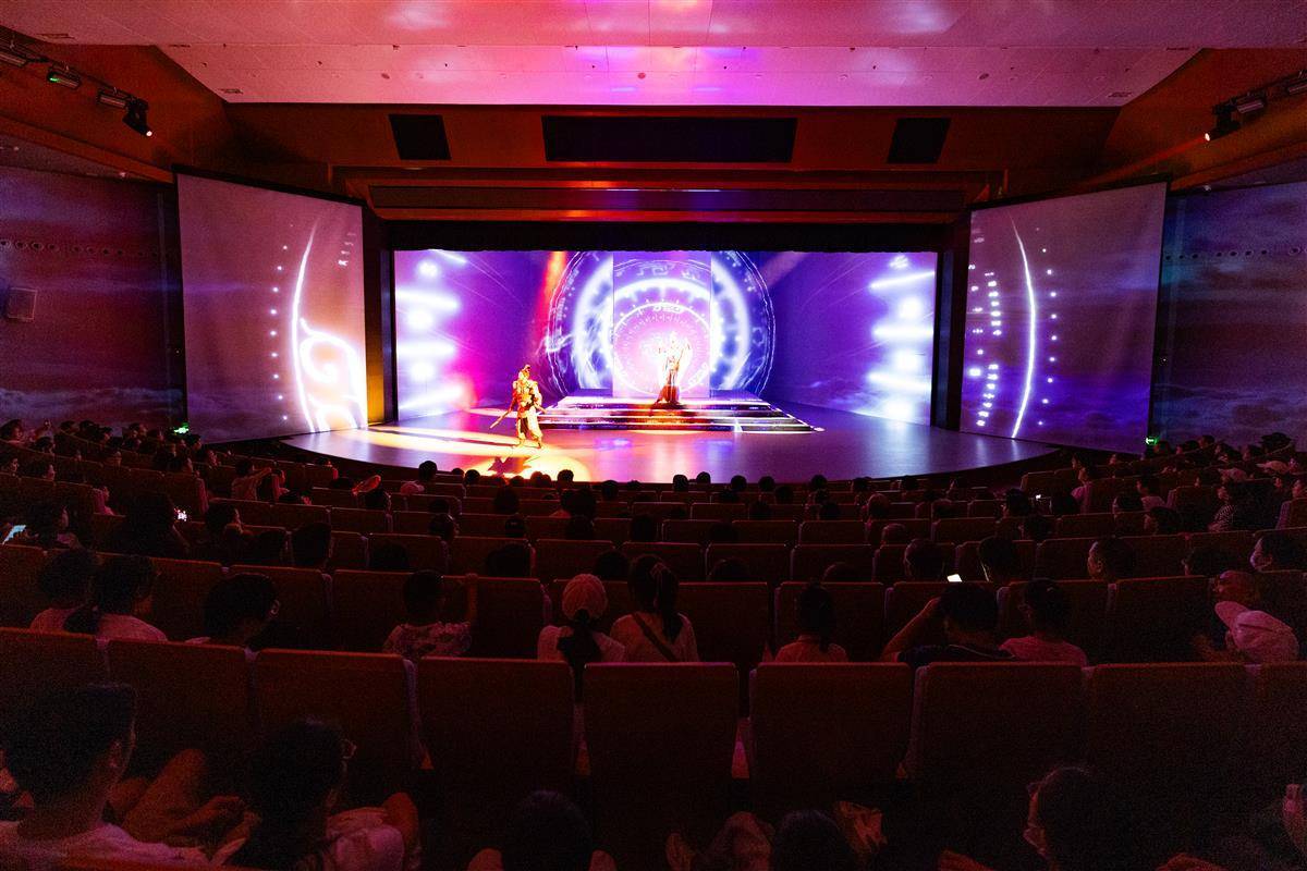 2025年10月1日,“十一”小长假首日,湖北省博物馆上新的沉浸式真人全息舞台剧《遇见·勾践剑》吸引大批市民游客前来观看,场场爆满,座无虚席。该剧把宏大绚丽的沉浸式全息影像与真人表演深度融合,使数字科技与历史脉络交相辉映。在30分钟的演出中,文物不再是静置于展柜中的器物,而是“活”起来、可与观众握手对话的“老朋友”。(湖北日报全媒记者 何宇欣 摄)