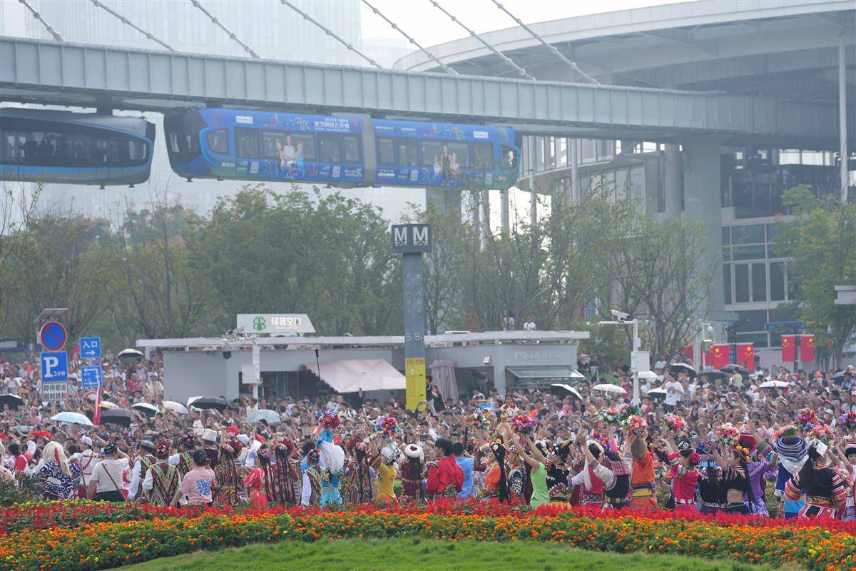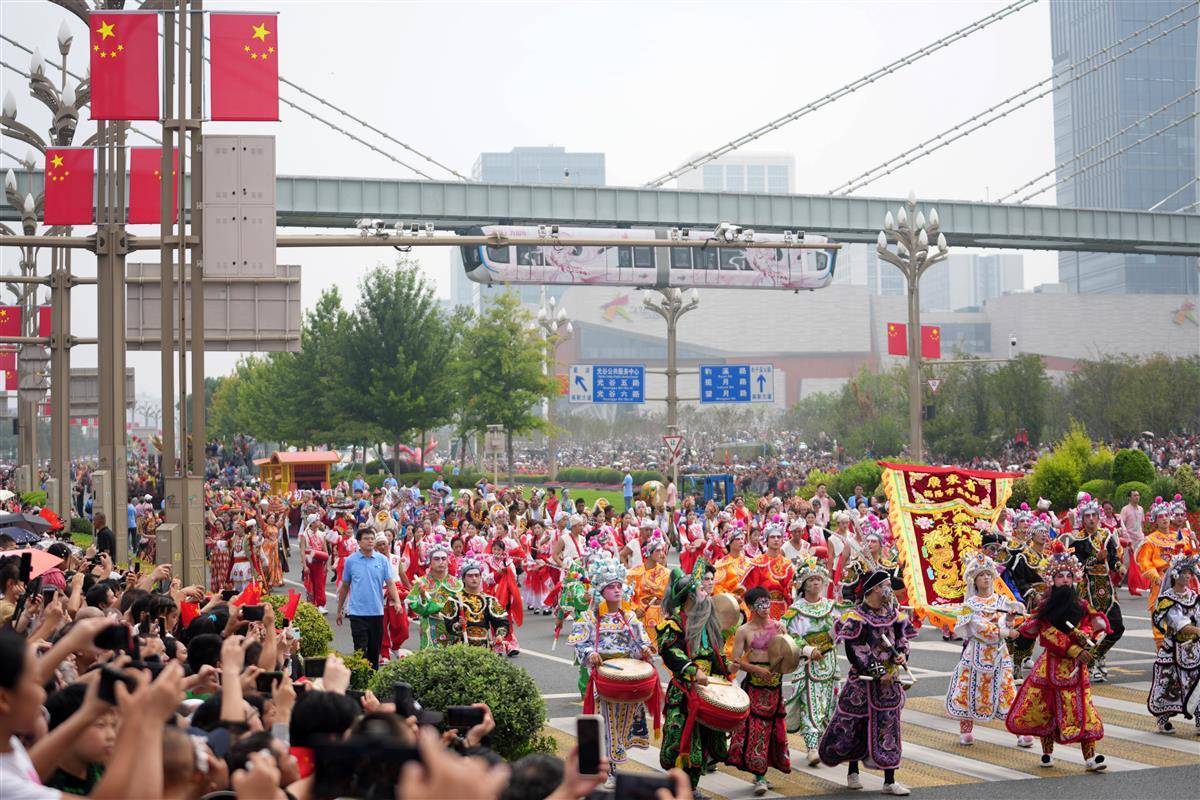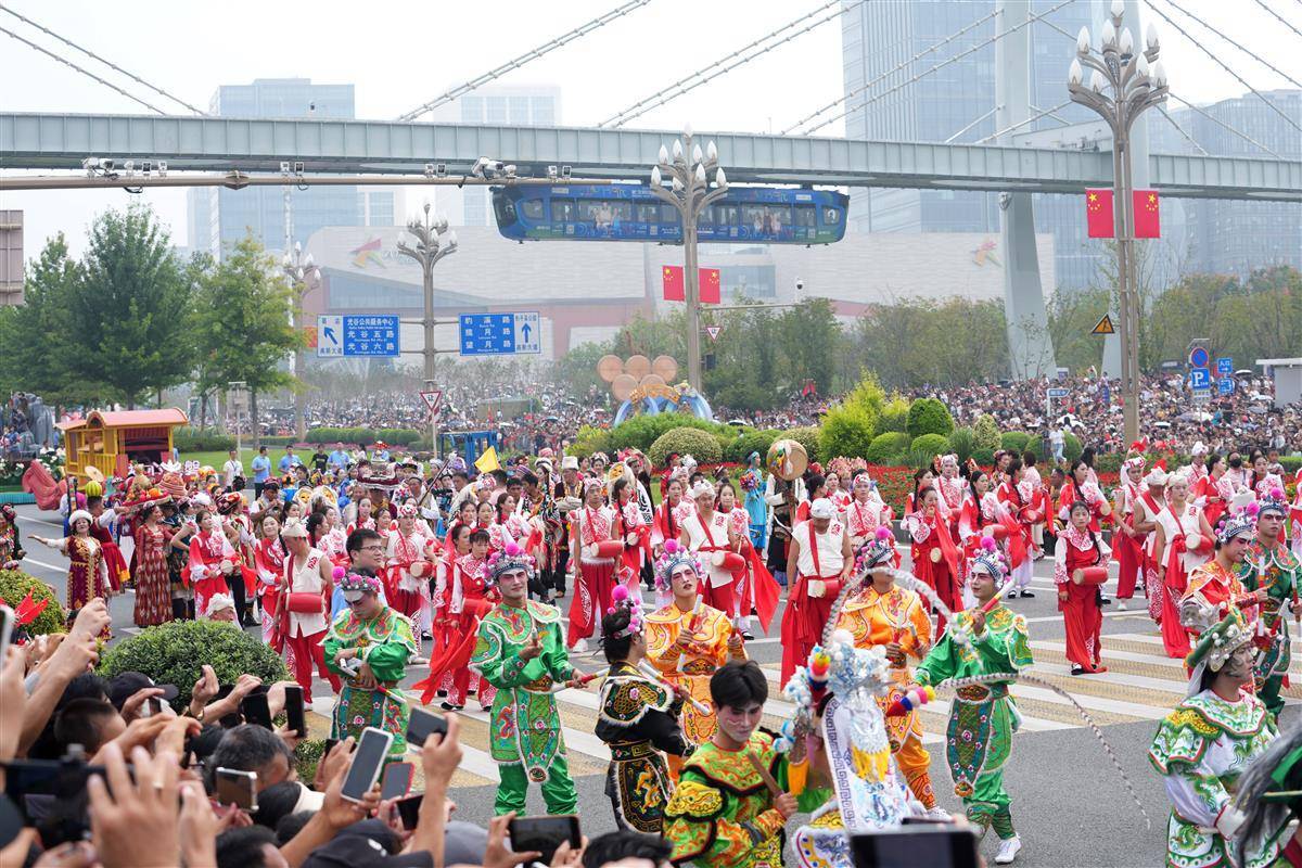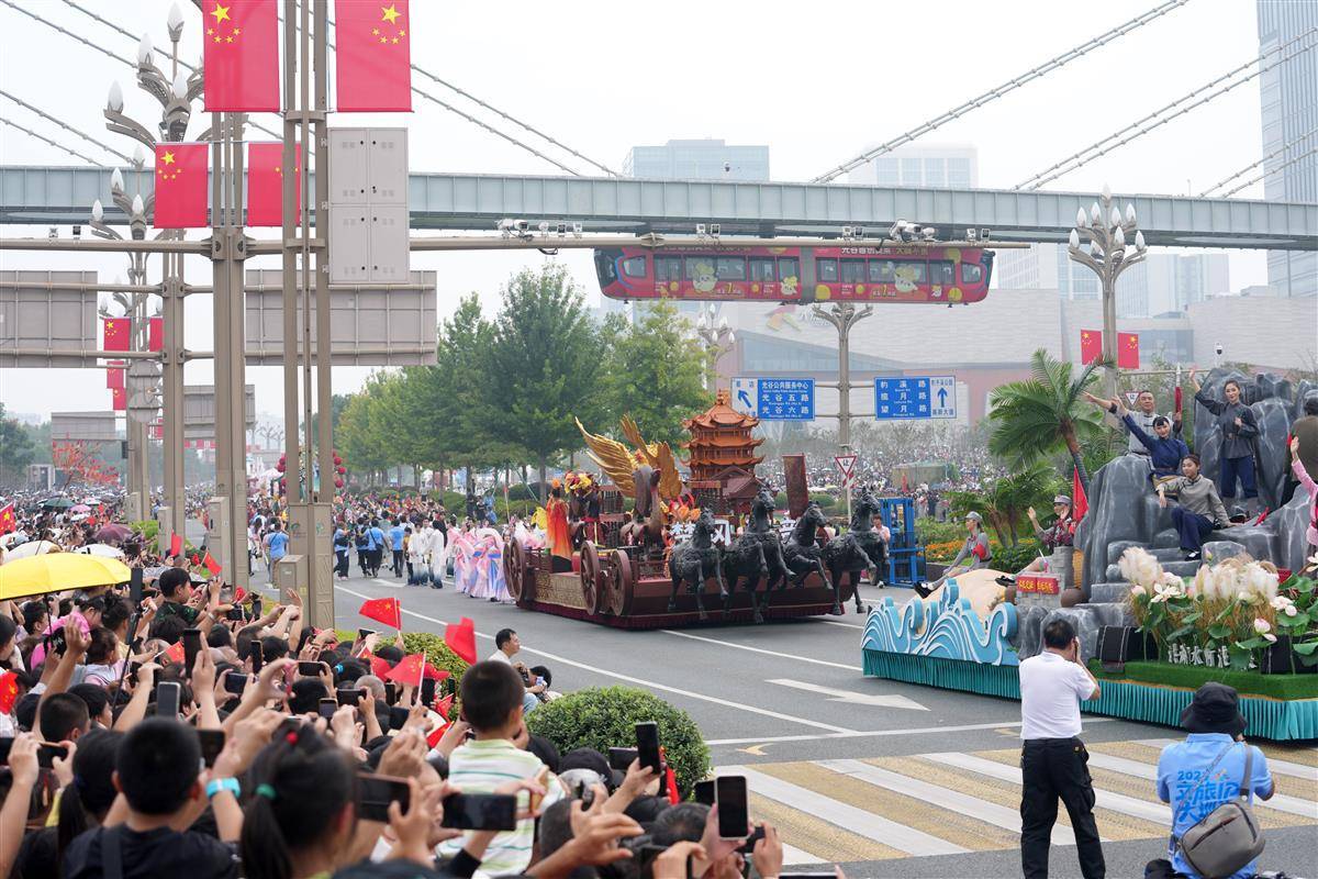 10月1日,武汉光谷高新大道,“河山添锦绣”文旅IP城市大巡游与科幻的光谷空轨同框。“河山锦绣”“初心如磐”“楚风汉韵”“非遗国潮”“动漫萌宠”“全球狂欢”等23台主题花车让市民、游客大饱眼福。广东英歌舞、西藏山南藏戏、福建泉州“簪花围”、四川变脸等38组特色文旅表演团队轮番登场表演、与观众互动。(湖北日报全媒记者 魏铼 摄)