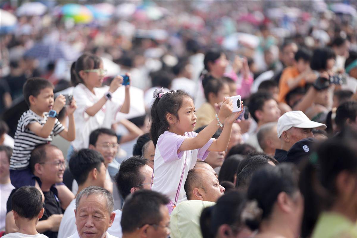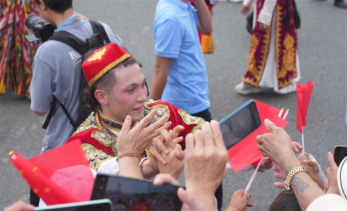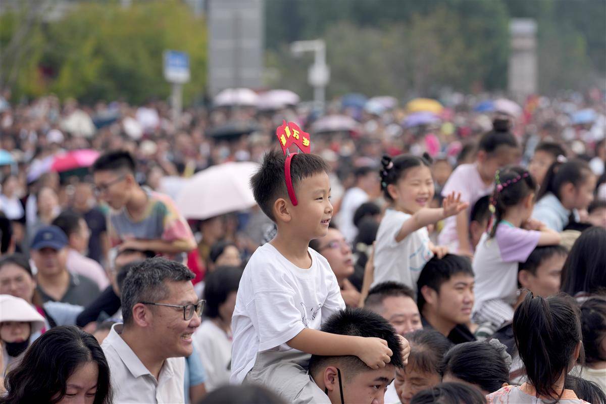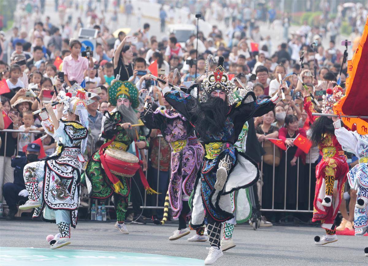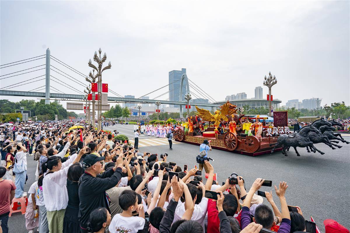 10月1日,武汉光谷高新大道,“河山添锦绣”文旅IP城市大巡游与科幻的光谷空轨同框。“河山锦绣”“初心如磐”“楚风汉韵”“非遗国潮”“动漫萌宠”“全球狂欢”等23台主题花车让市民、游客大饱眼福。广东英歌舞、西藏山南藏戏、福建泉州“簪花围”、四川变脸等38组特色文旅表演团队轮番登场表演、与观众互动。(湖北日报全媒记者 魏铼 摄)