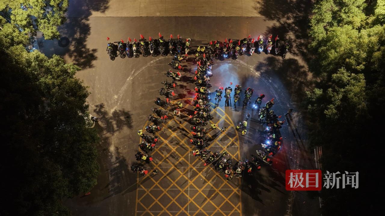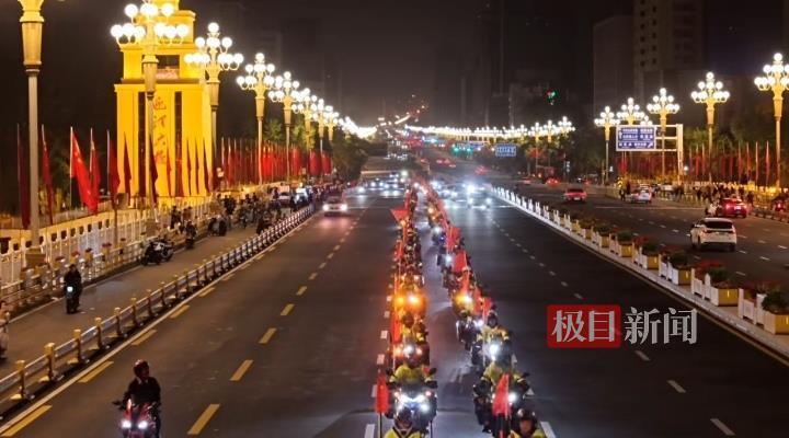 10月1日凌晨2时许,山西太原网红打卡地迎泽大桥,76辆摩托车组成巡游车队,带着76面五星红旗,后在桥面灯光辉映下缓慢前行,出发前还特意摆出“76”造型,庆祝新中国成立76周年。