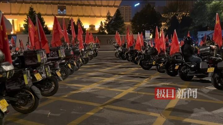 出发前,76辆摩托车摆出“76”造型,每辆摩托车上都插着一面长80厘米、宽60厘米的国旗。1日凌晨2时整,车队出发开上长约1公里的迎泽大桥。76辆摩托车,76面五星红旗,在桥面橙黄色灯光的映照下,色彩更加鲜艳,在桥面劲风的吹拂下,飘扬得更加有力。