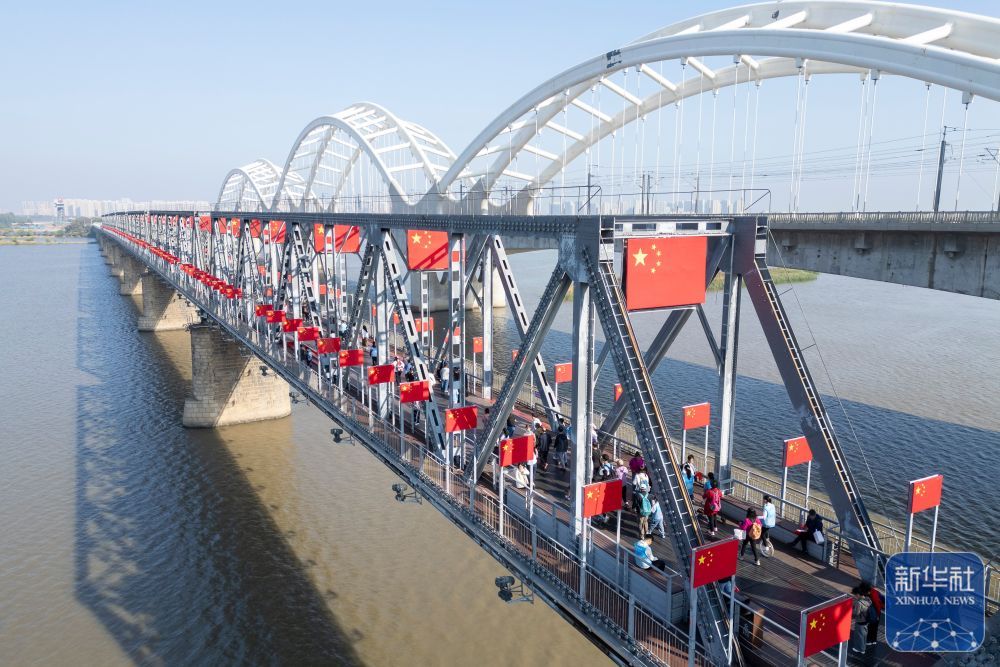 ↑ 10月1日,游客在哈尔滨市滨州铁路桥上游览(无人机照片)。新华社记者 张涛 摄
