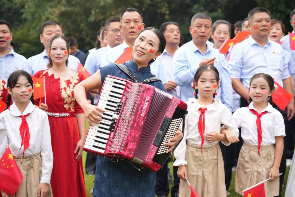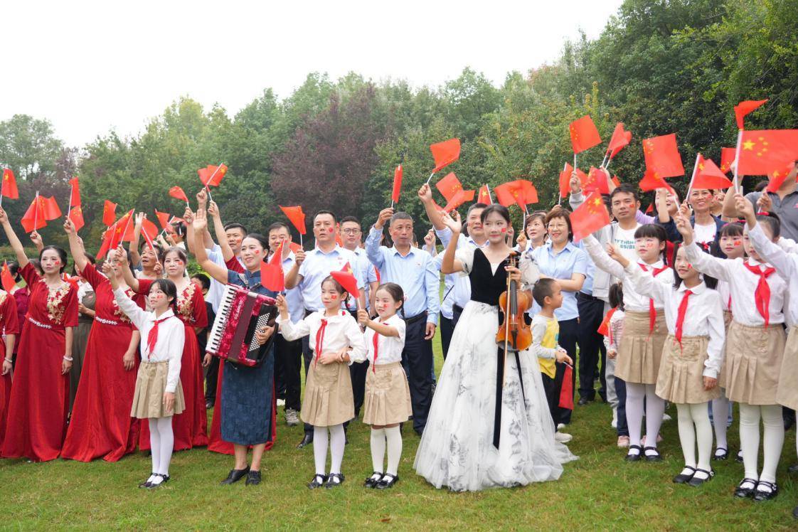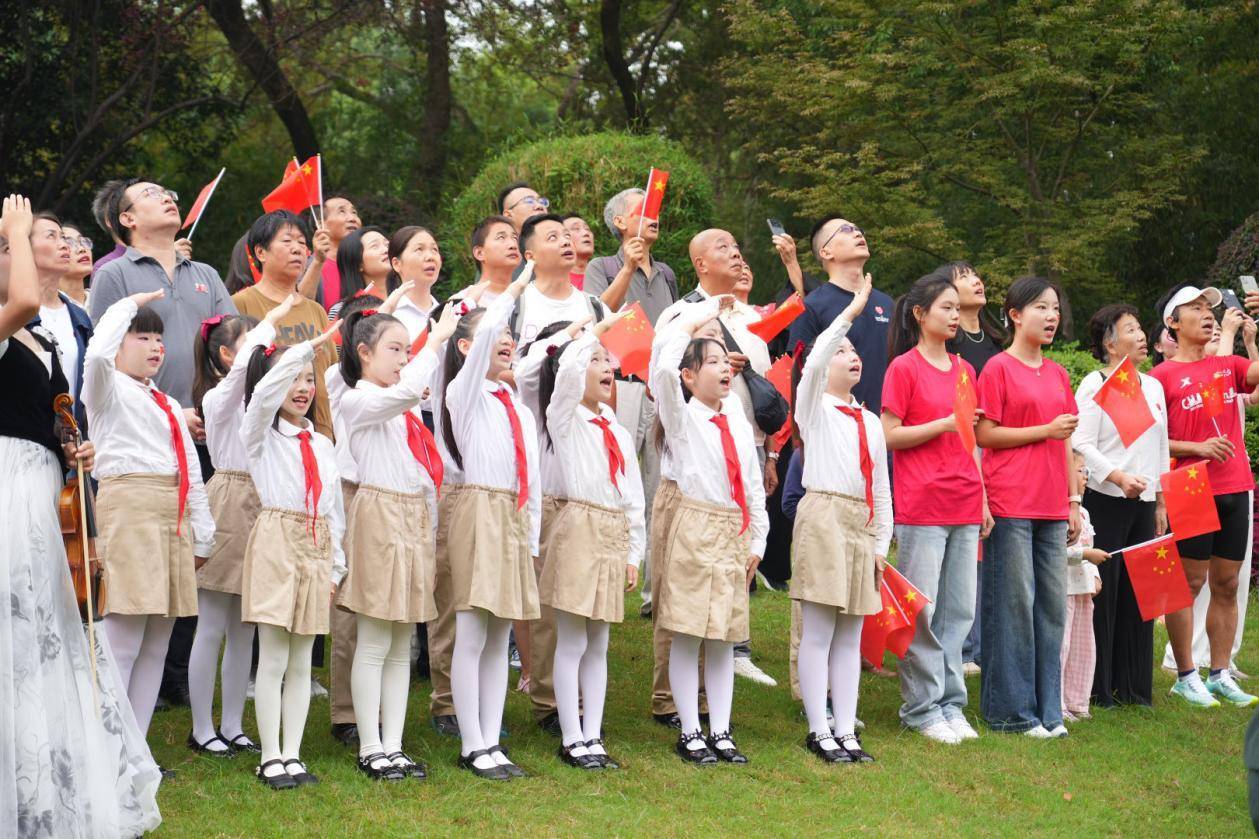 “我和我的祖国,一刻也不能分割……”当管弦乐团奏响熟悉的旋律时,在专业领唱的引领和感染下,游客们不约而同地挥舞着手中的红旗,共同歌唱祖国。现场志愿者们穿梭在人群中,热情地向游客发放国旗和国庆主题脸贴,吸引更多人加入合唱队伍。