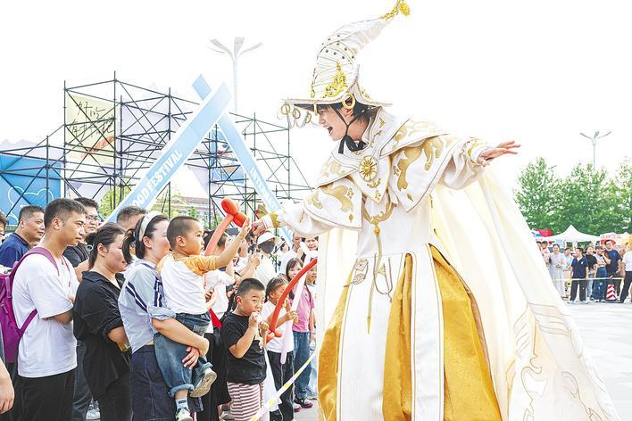 乌镇戏剧节创作班底空降甘露山文创城,带来最新力作——中国首部魔法主题高跷巡游偶剧《大魔法师》,这也是该剧的全国首演。下午2时,首演场次开场,剧情随着开场音乐响起。高2.4米的白袍巫师哈瑞、精灵法师瑞秋、黑袍赫仑等IP角色依次登场。踩着高跷的魔法师演绎了一个惊险刺激的魔法故事,现场观众掌声连连。来自随州的游客赵雨兴奋不已:“第一次看到魔法还能变成故事!”