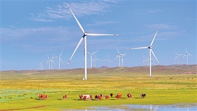 内蒙古自治区乌兰察布市,风力发电机将风能转化为绿色电能。