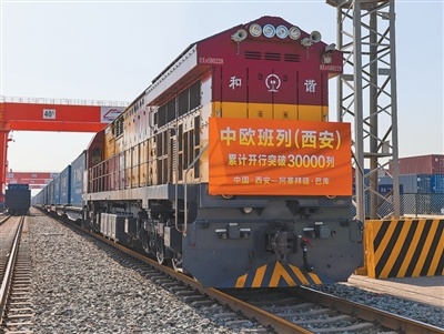 陕西省西安市,满载光伏组件的中欧班列从西安国际港站驶出。