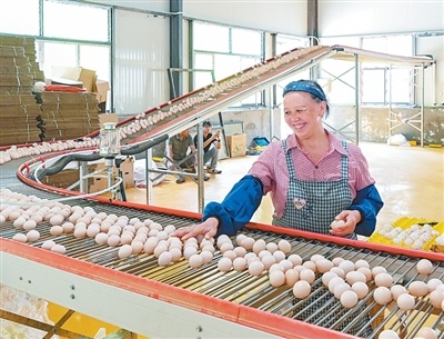 贵州省晴隆县,东西部协作项目资金支持的一家蛋鸡养殖场内,工人在分拣鸡蛋。