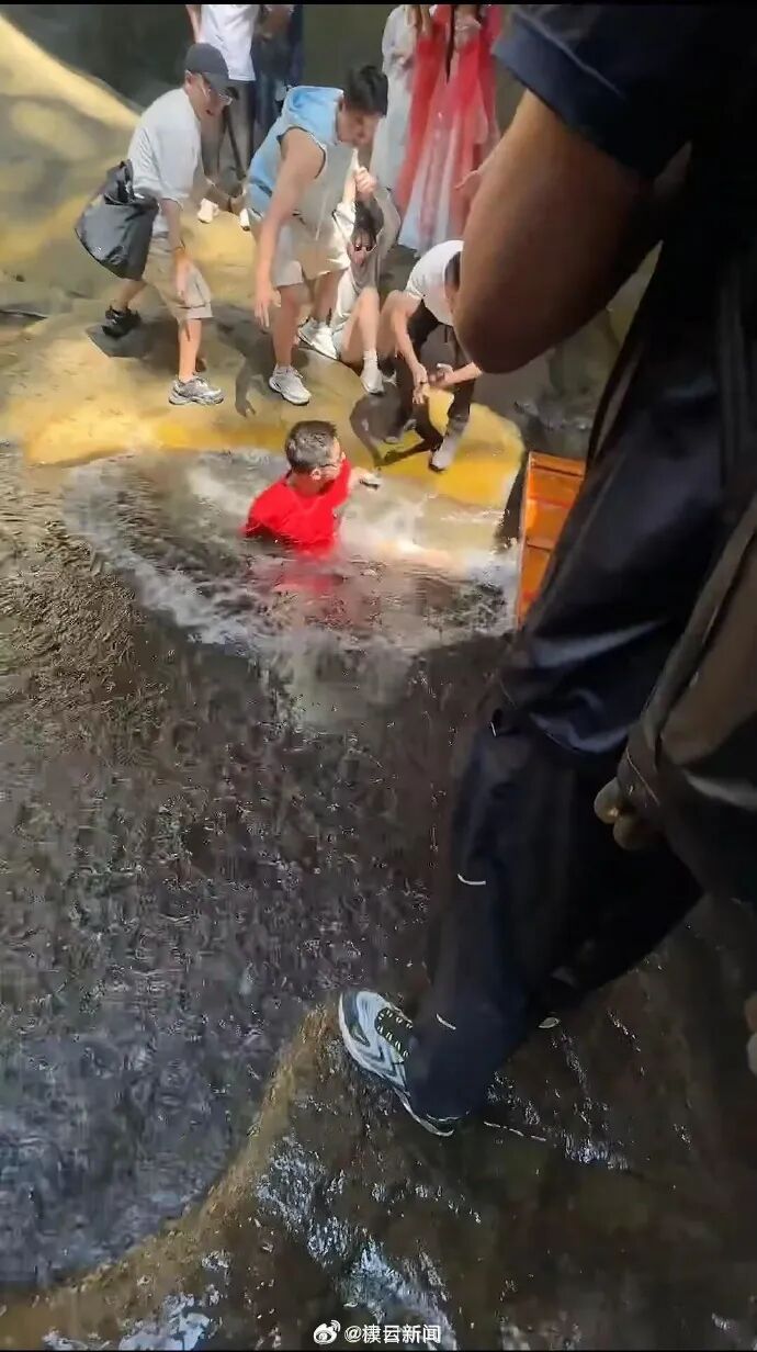 结果出现意外一幕,张继科被游客不小心“滑铲”掉水里,旁边游客纷纷伸手试图拉住他。事后张继科在社交平台发文提醒:“假期出行,注意安全。”
