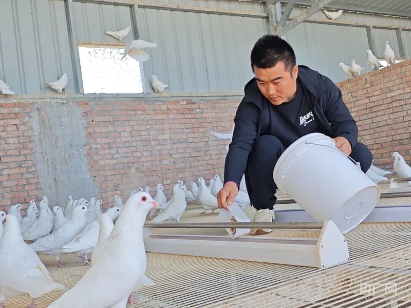 养殖户正在喂养鸽子 (央广网发 七师胡杨河市融媒体中心供图)