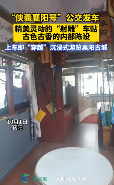 10月1日,“侠义襄阳”旅游公交车惊艳上线,车身精美、内饰古雅,仿佛将人带入唐宋江湖。