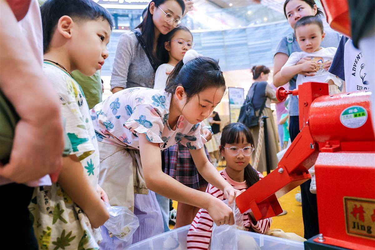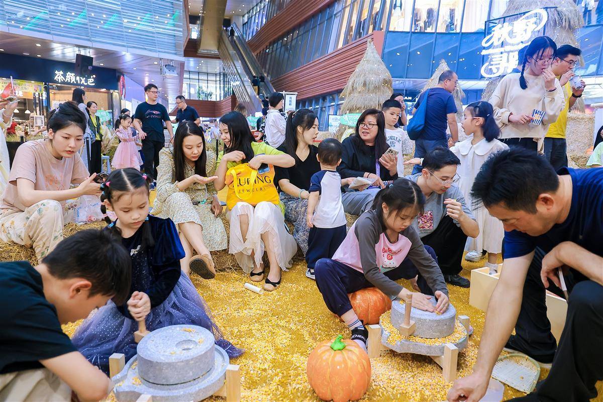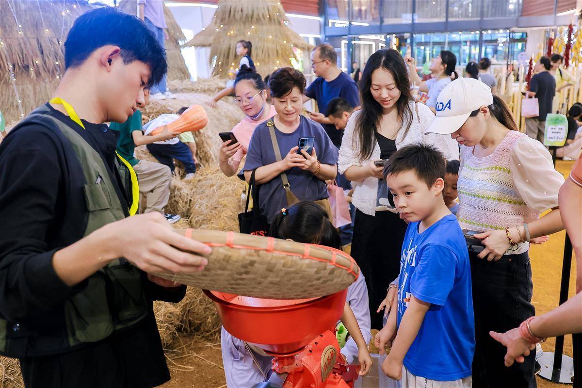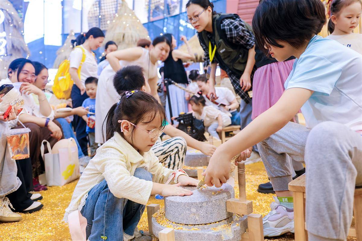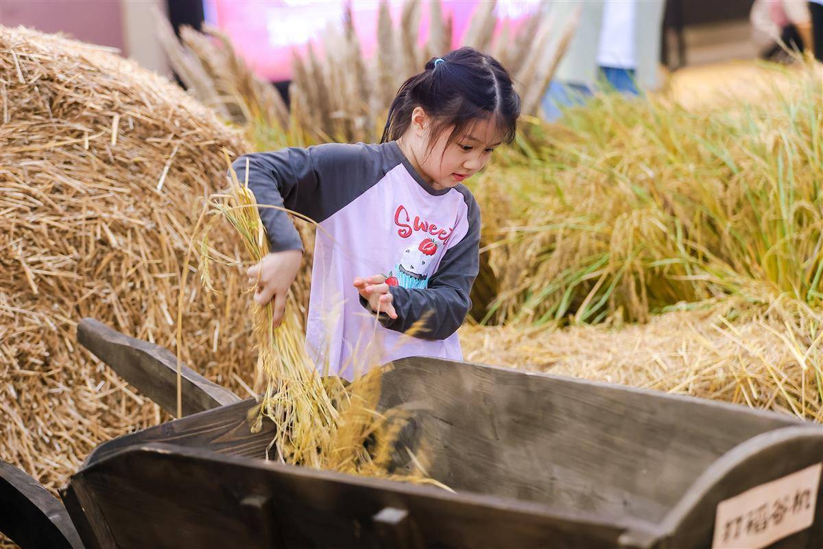 2025年10月2日,“十一”小长假第二日,在武汉群星城,一场沉浸式农耕体验活动吸引大批家长带小朋友前来体验,孩子们在工作人员的指引下模拟收稻谷、磨稻子、剥稻子,沉浸式体验从稻田到餐桌的乐趣,感受农耕文化的浓厚魅力。(湖北日报全媒记者 何宇欣 摄)