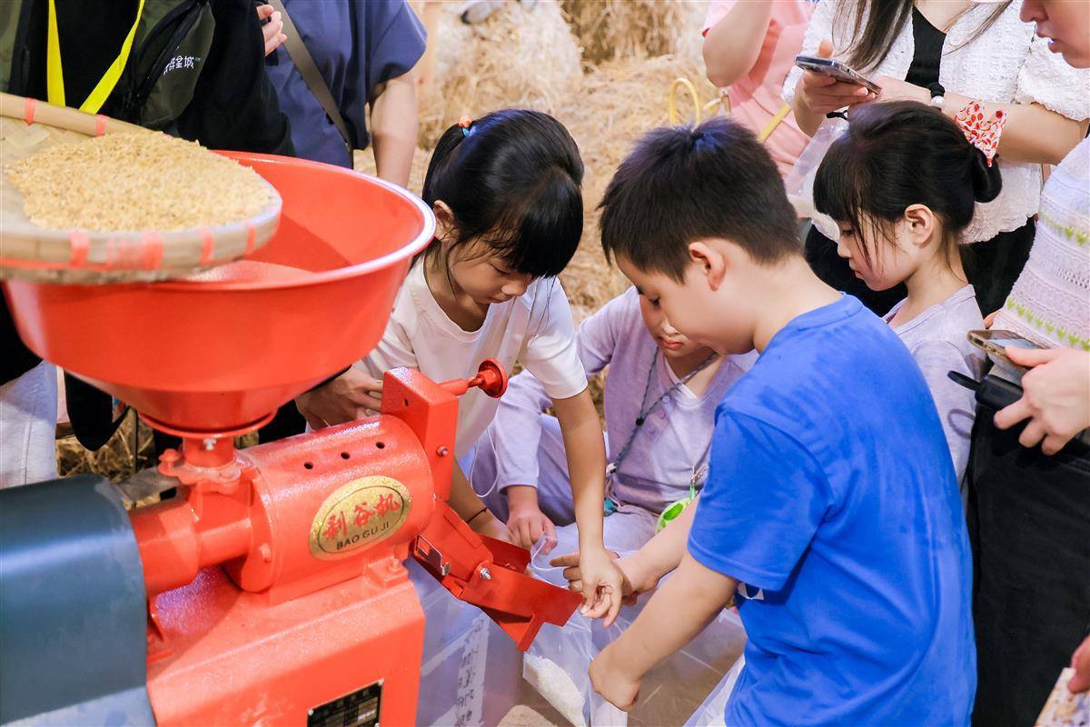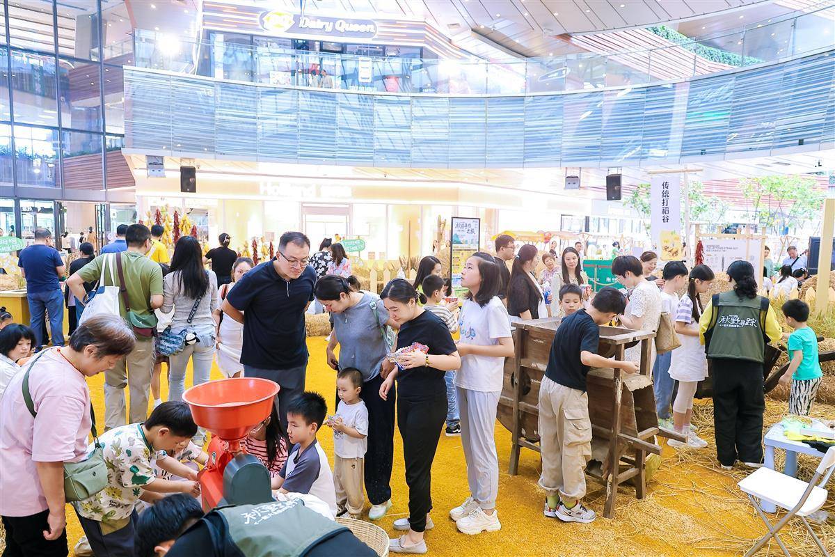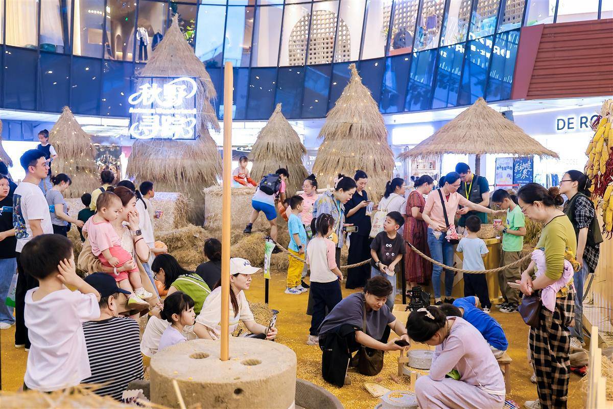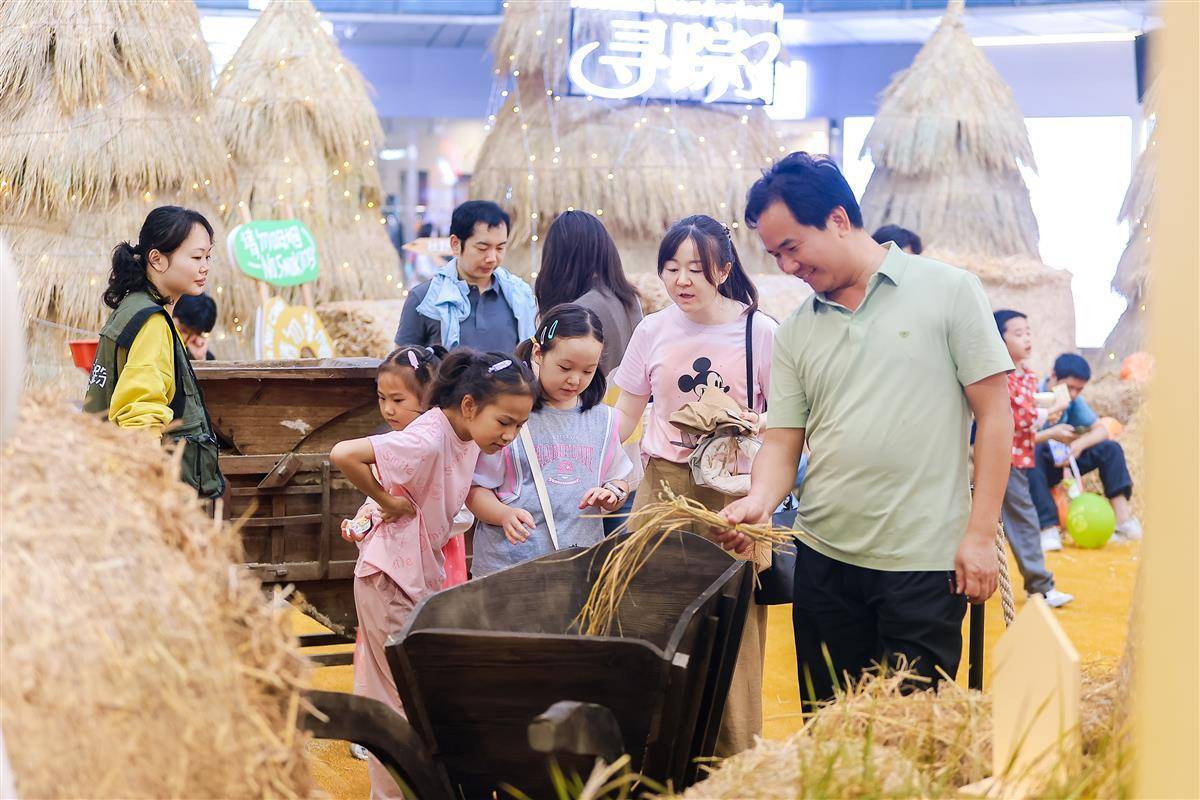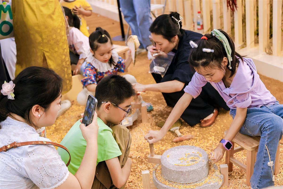 2025年10月2日,“十一”小长假第二日,在武汉群星城,一场沉浸式农耕体验活动吸引大批家长带小朋友前来体验,孩子们在工作人员的指引下模拟收稻谷、磨稻子、剥稻子,沉浸式体验从稻田到餐桌的乐趣,感受农耕文化的浓厚魅力。(湖北日报全媒记者 何宇欣 摄)