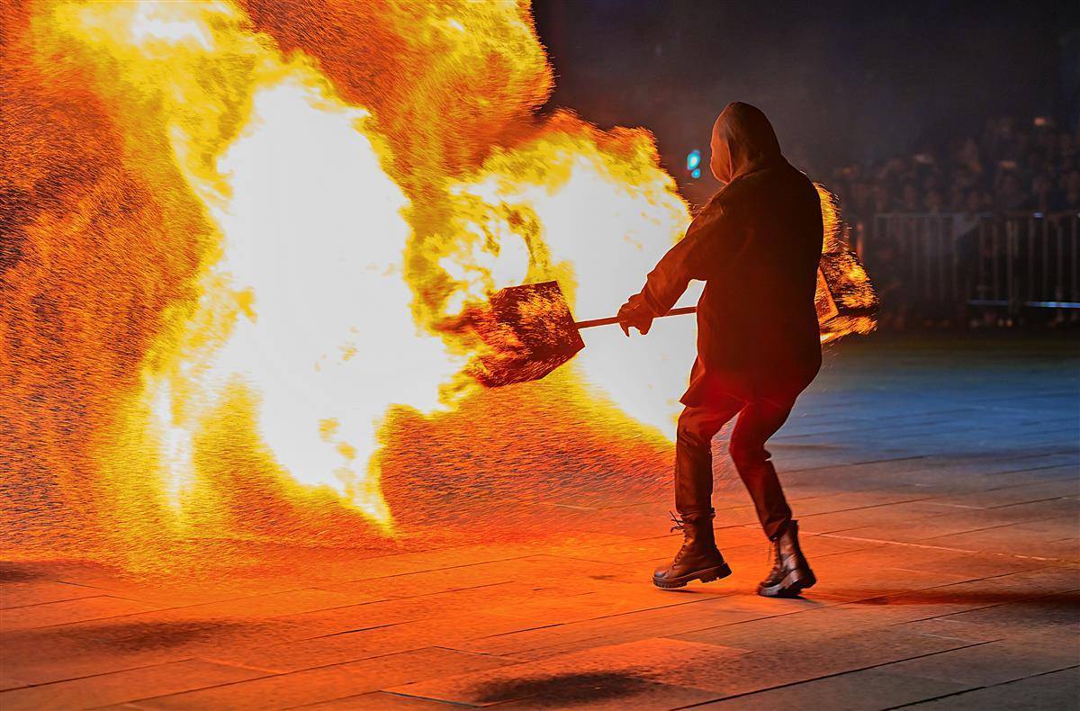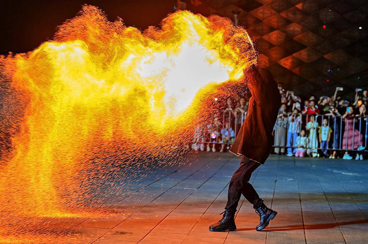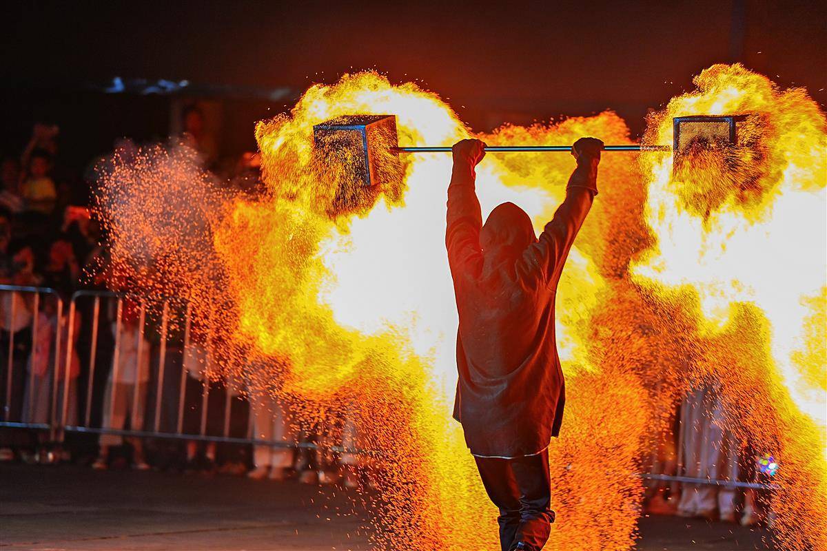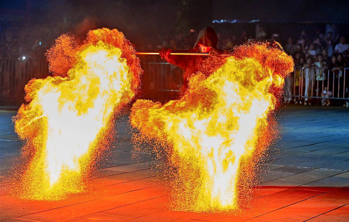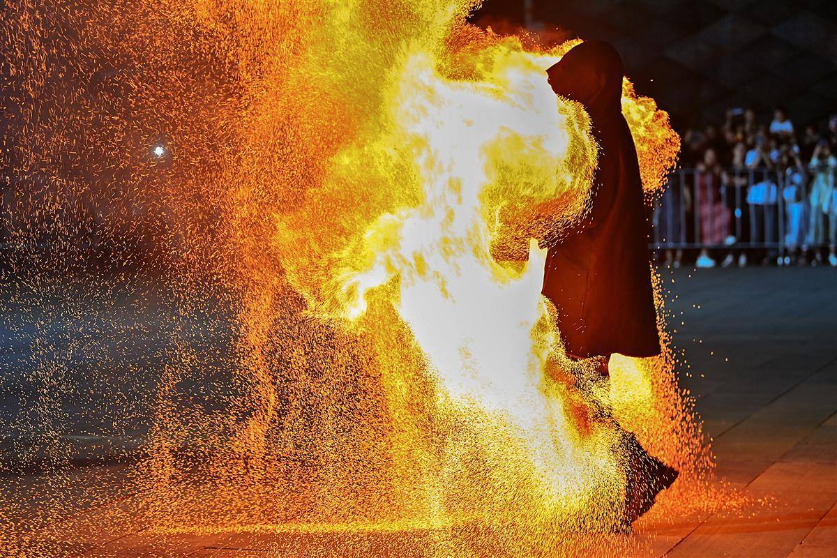 10月2日晚,武汉江夏区谭鑫培公园戏楼广场上,一青年男子的中国非遗火壶表演,火树银花场面震撼引发关注。表演者将烧好的木炭放入两边的铁网,通过抖动产生火花,现场一片火树银花。据悉,火壶表演是国家级非物质文化遗产之一,寓意驱疾避祸,百家安宁。(湖北日报全媒记者 朱熙勇 摄)