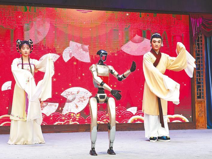 在黄梅县东山问梅村的大戏台上,智能机器人与黄梅戏演员同台表演黄梅戏。(湖北日报通讯员 熊丹娜 摄)