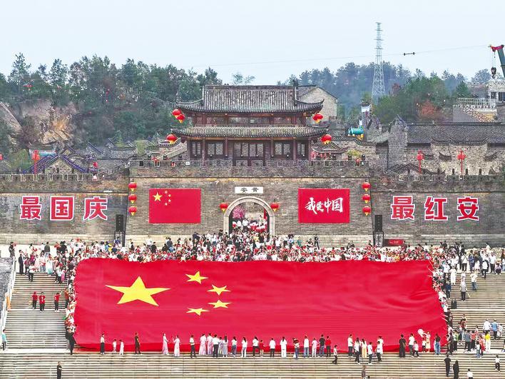 “十一”长假期间,巨幅国旗耀红安,“大别山国潮文化旅游节”在红安影视幻城举行。“赤黄红”荆风楚韵文化旅游线路精彩纷呈。(湖北日报通讯员 王亮 摄) 相关报道>>>第2版