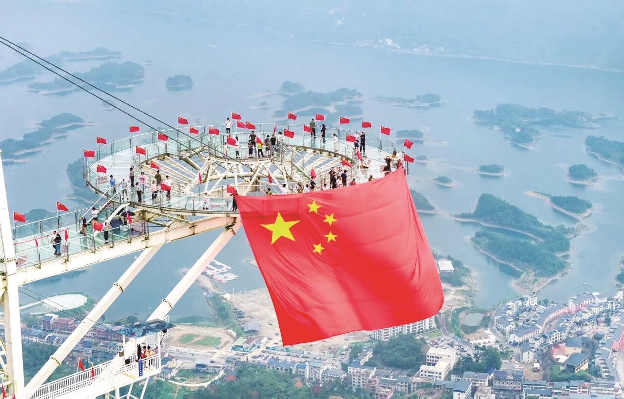 10月1日,阳新天空之城景区游人如织。在海拔520.1314米的天空之镜玻璃观景平台上,20米巨幅国旗迎风飘扬,国风大鼓奏响节日的乐章,游客们齐唱国歌,留下对祖国最美好的祝愿。 楚天都市报极目新闻通讯员石勇 周巍 鄢巍摄