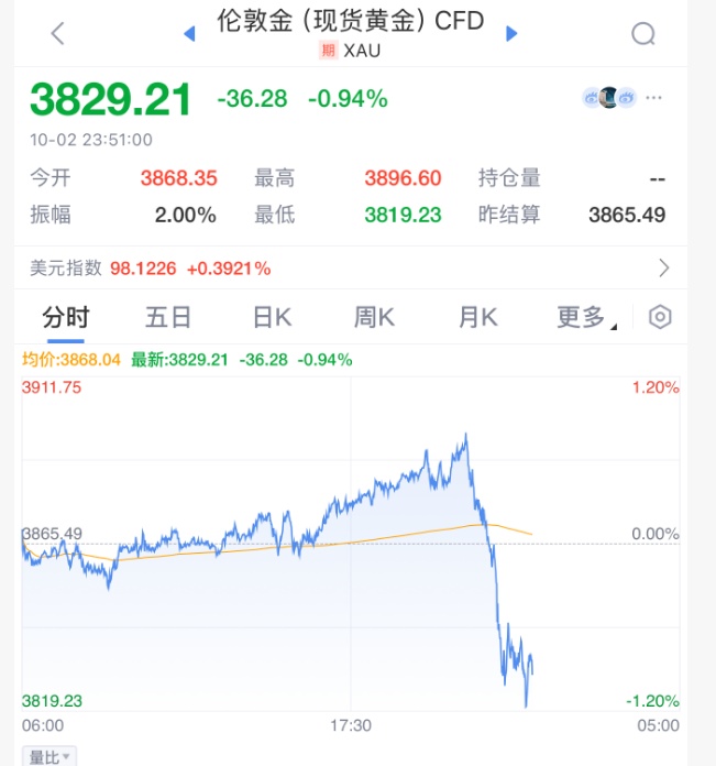 10月2日晚间,不断创下新高的黄金价格,突然大幅度跳水,持续走低,一度跌破3820美元/盎司,日内较最高点回落约80美元,一度跌超1%,此前一度大涨超1%至3896美元/盎司。