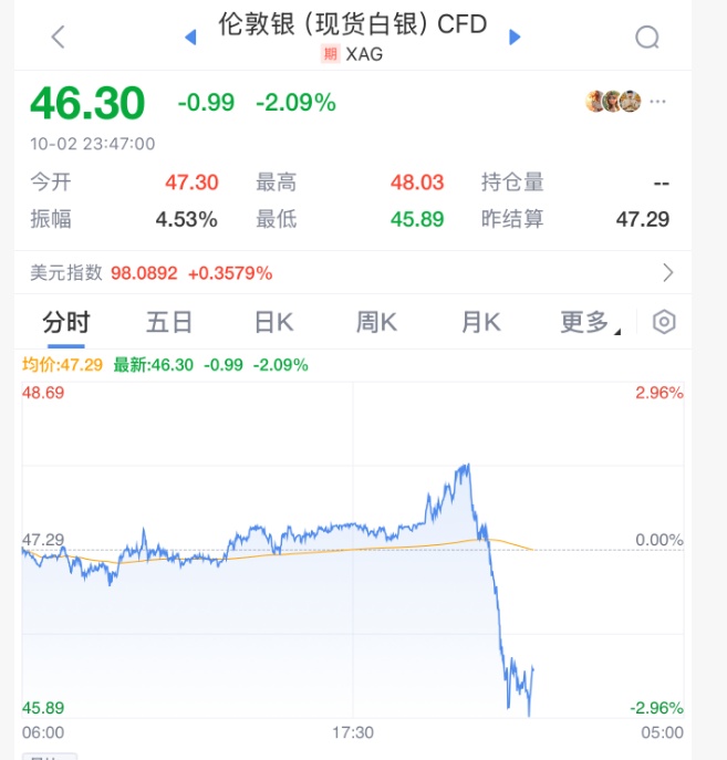 现货白银日内跌幅超2.00%,现报46美元/盎司,此前一度站上48美元/盎司。