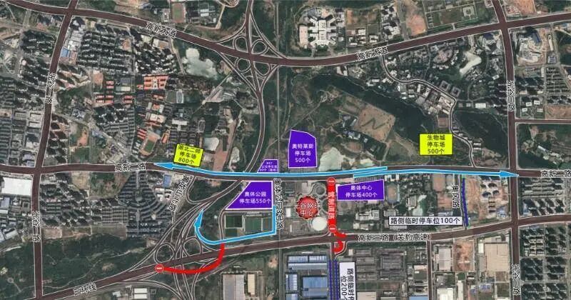 西向东方向来车:可停靠奥体公园地下停车场(550个)、奥体中心360停车场(400个);