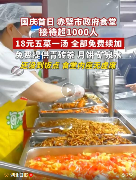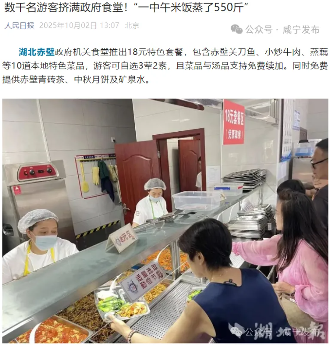 10月2日新华社、人民日报相继报道赤壁市在国庆中秋节期间开放政府机关食堂推出18元特色套餐包含赤壁关刀鱼、小炒牛肉、蒸藕等10道本地特色菜品为游客提供贴心服务成了节日期间一道美丽的风景线